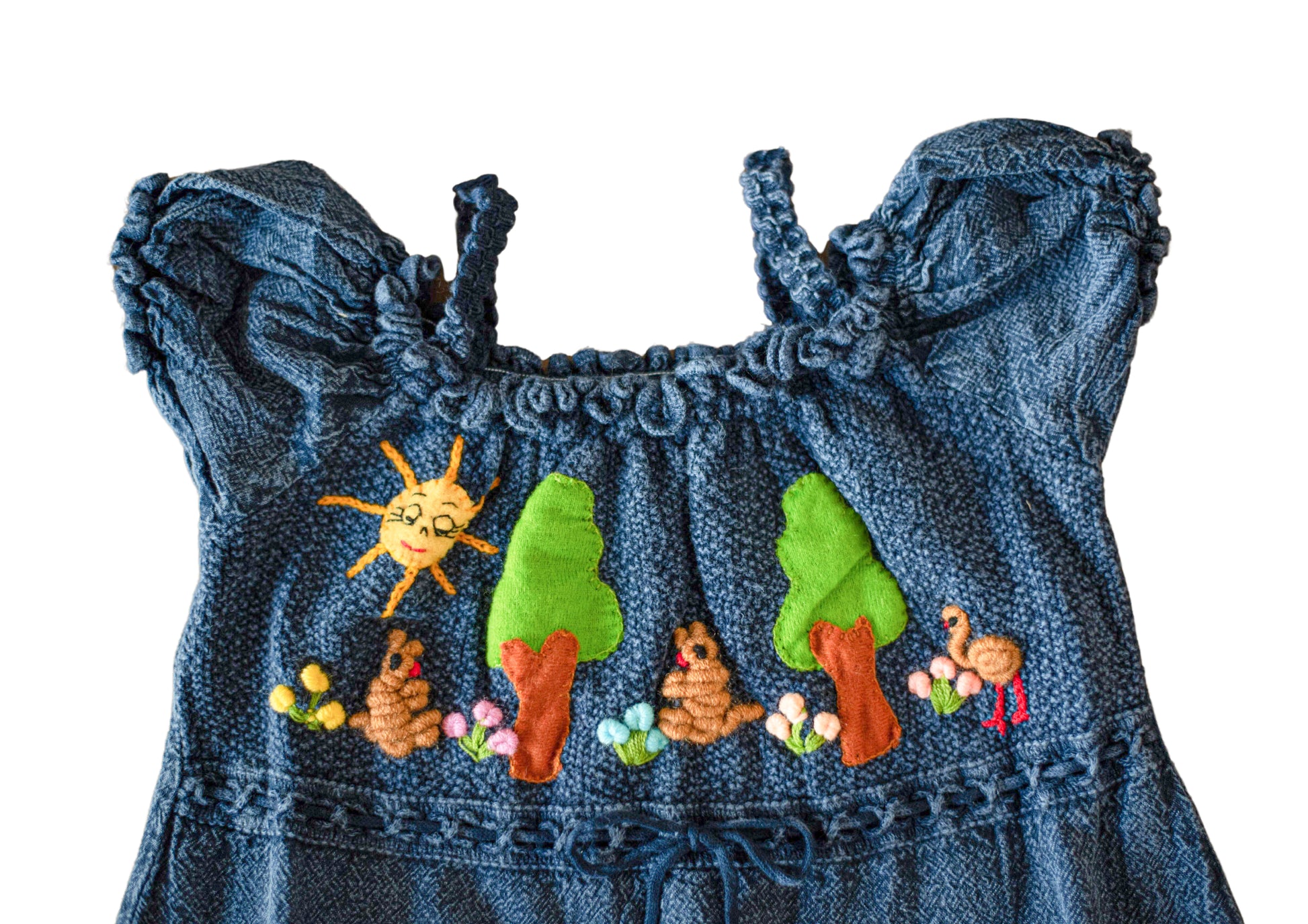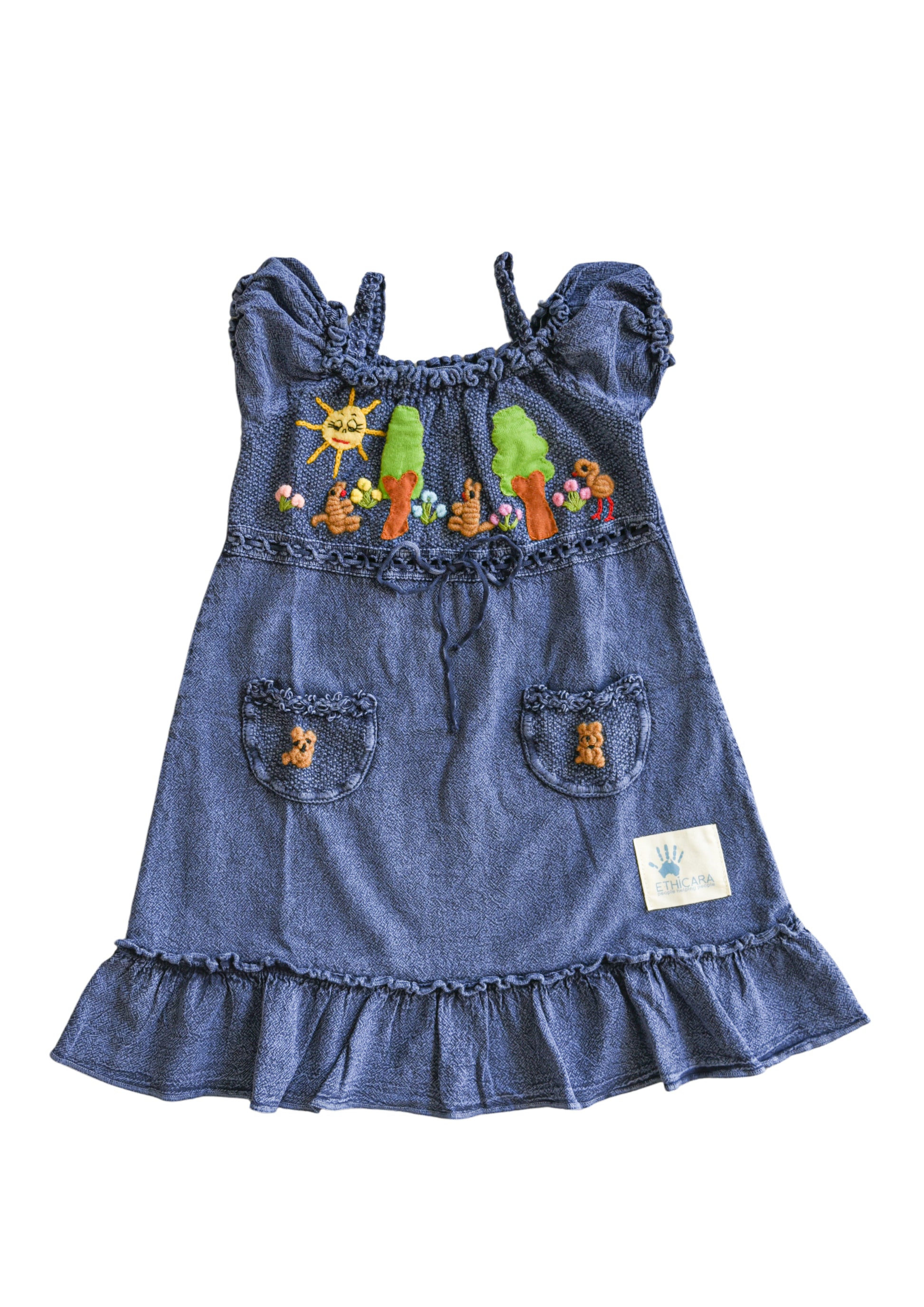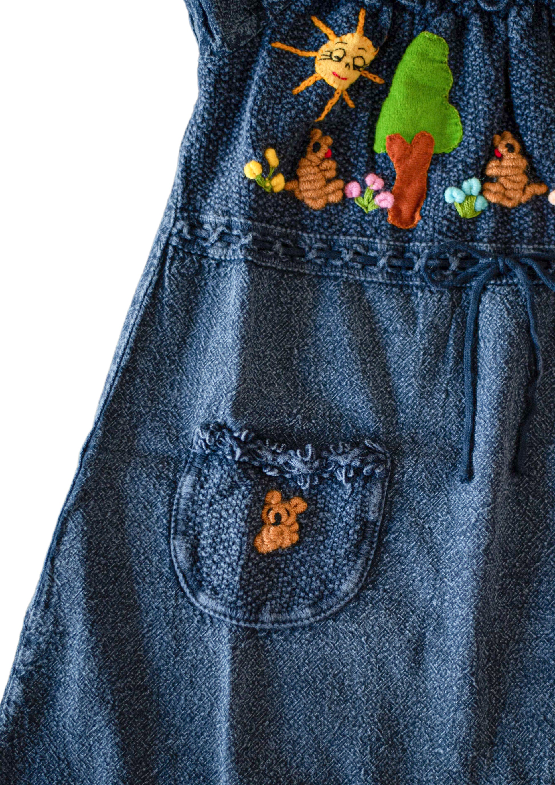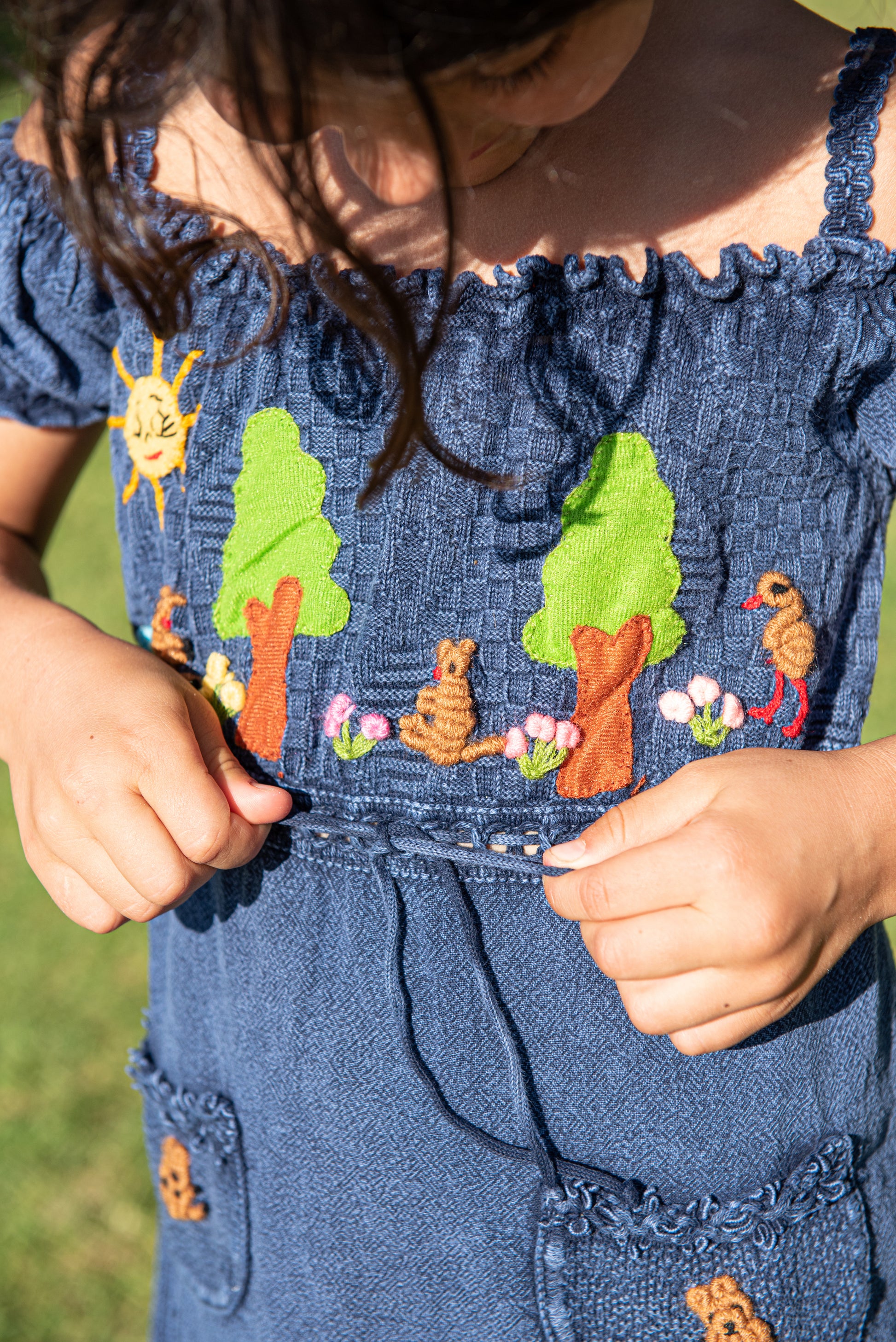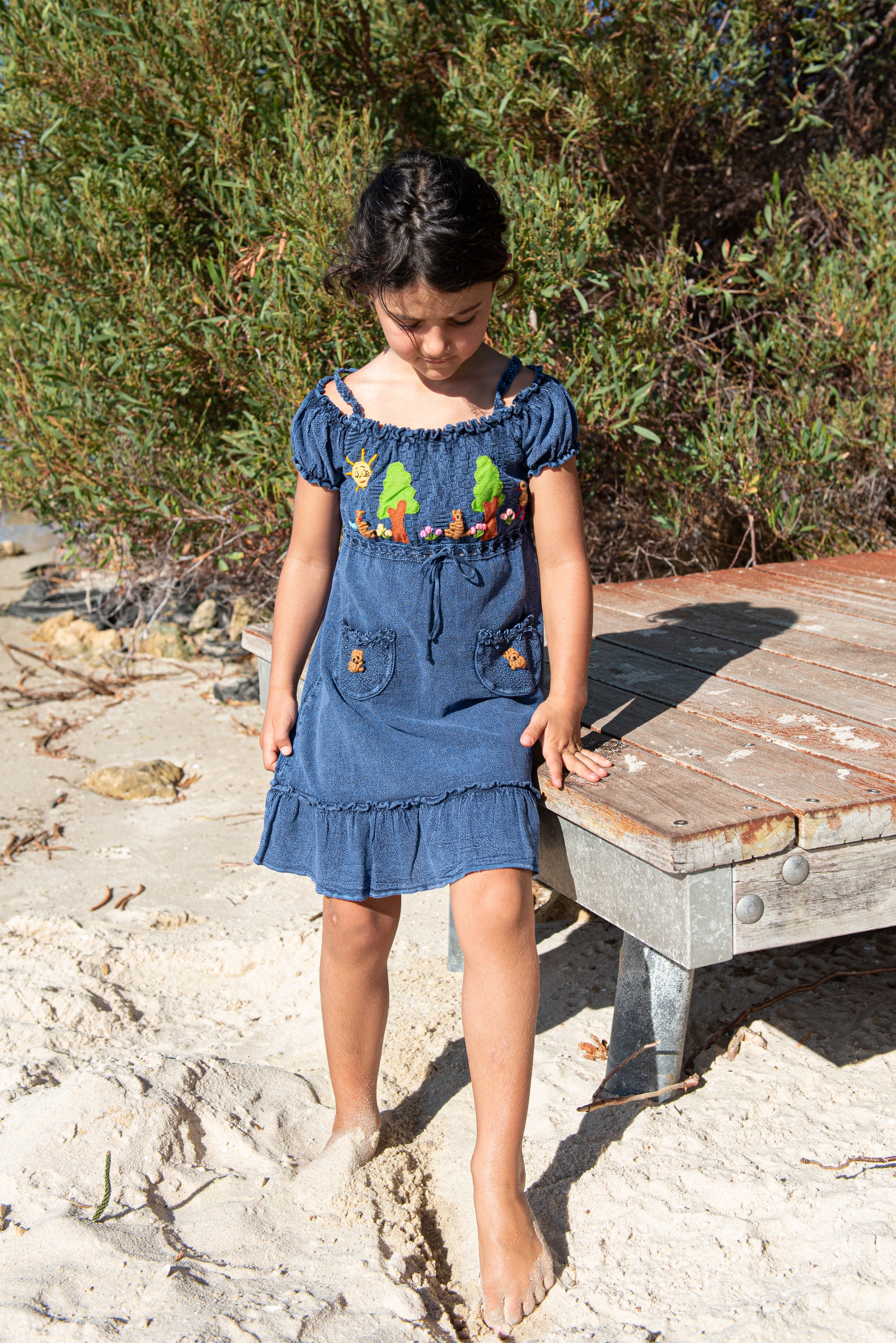 This Forest Dress is a shop favorite with pockets made for adventures! Our little customers can't resist filling these playful pouches with leaf treasures and twig wands. The embroidered Australian bush blooms with koalas in eucalyptus trees, hopping kangaroos, and curious emus under a stitched golden sky.