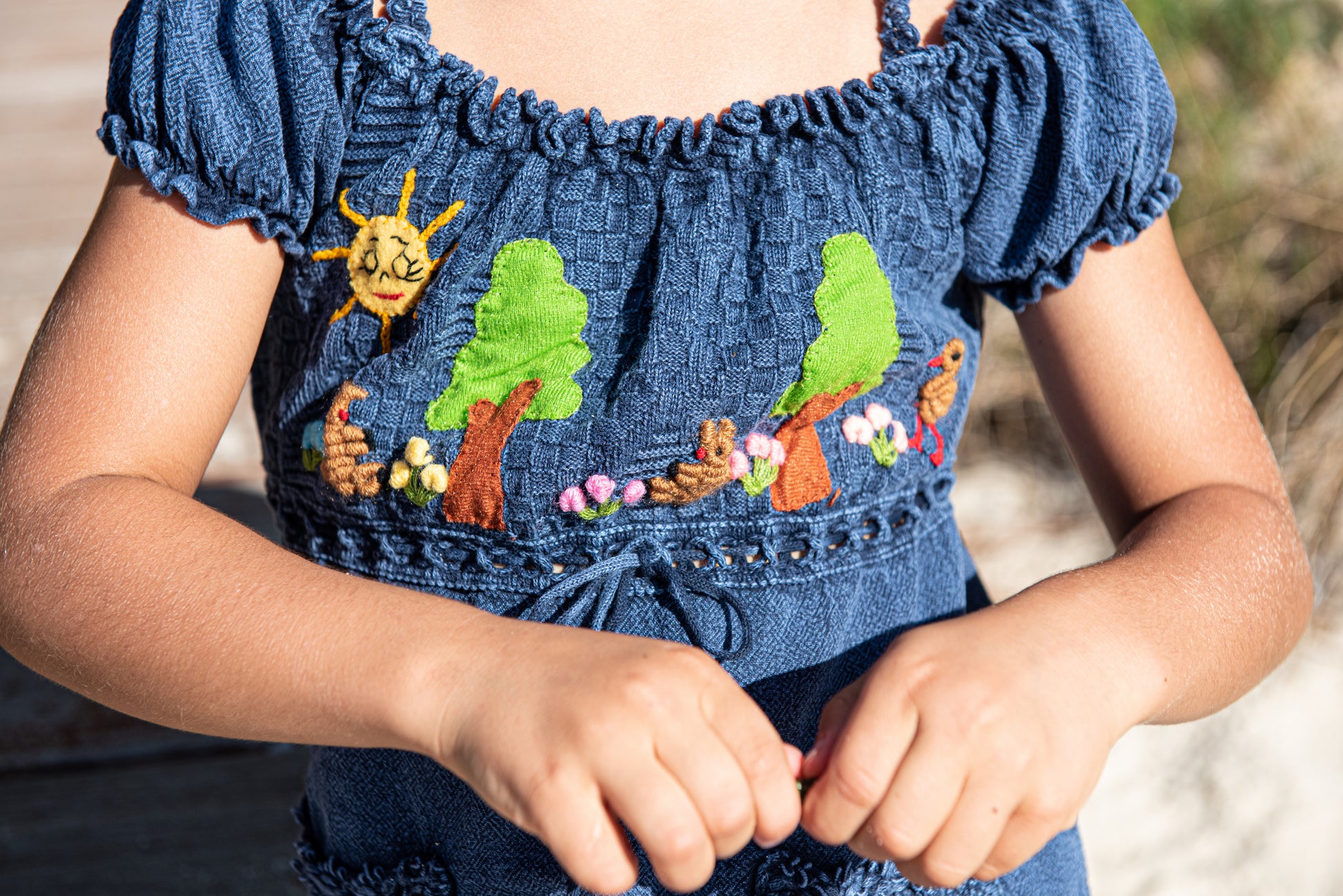 Breathable as sunlight through the branches, it's crafted by Peruvian artisans for ruling both fairy kingdoms and mud pie bakeries—with handy pockets for all her forest finds.