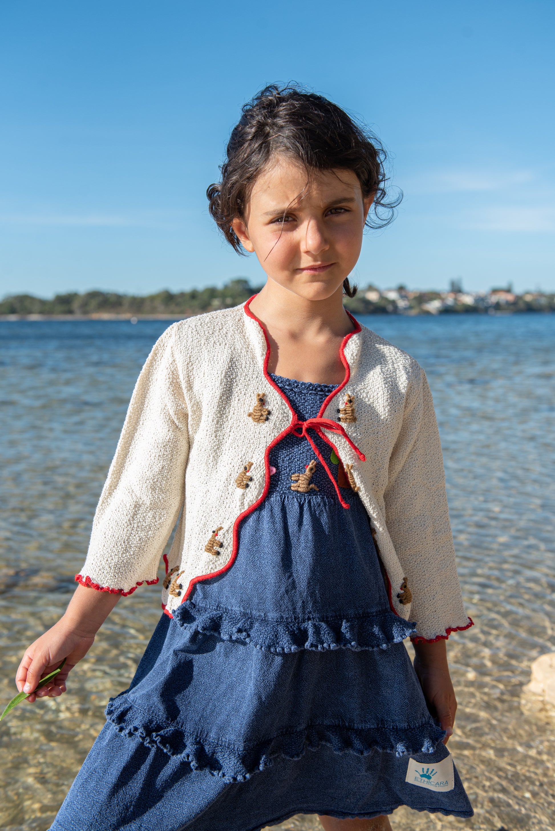 The Kangaroo Jacket is her cape for conquering puddles and playgrounds. The bounding roo embroidery mirrors her fearless spirit, zipped up for frosty mornings or tied around her waist for ‘superhero mode.’ Breathable fabric keeps up with her nonstop energy.