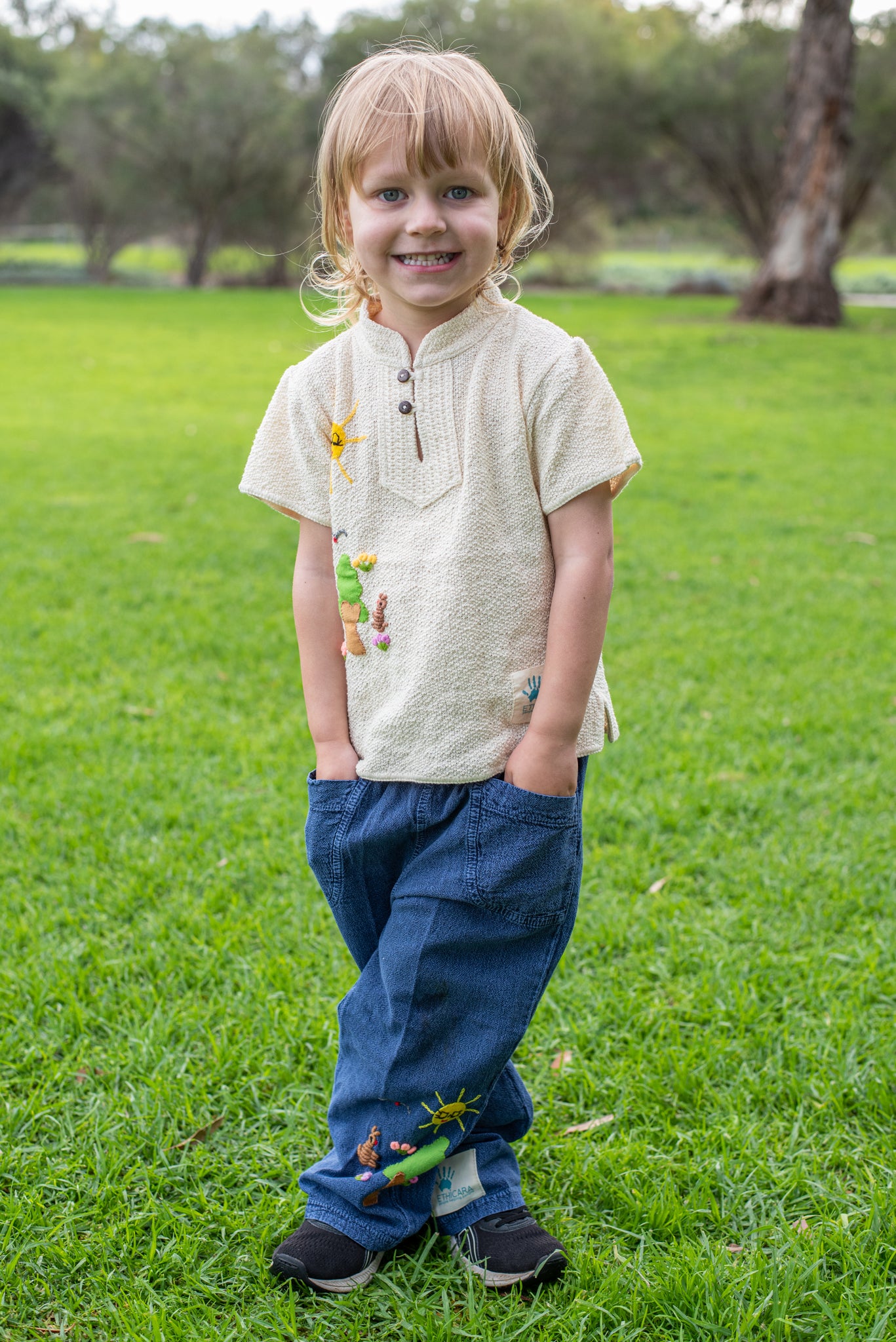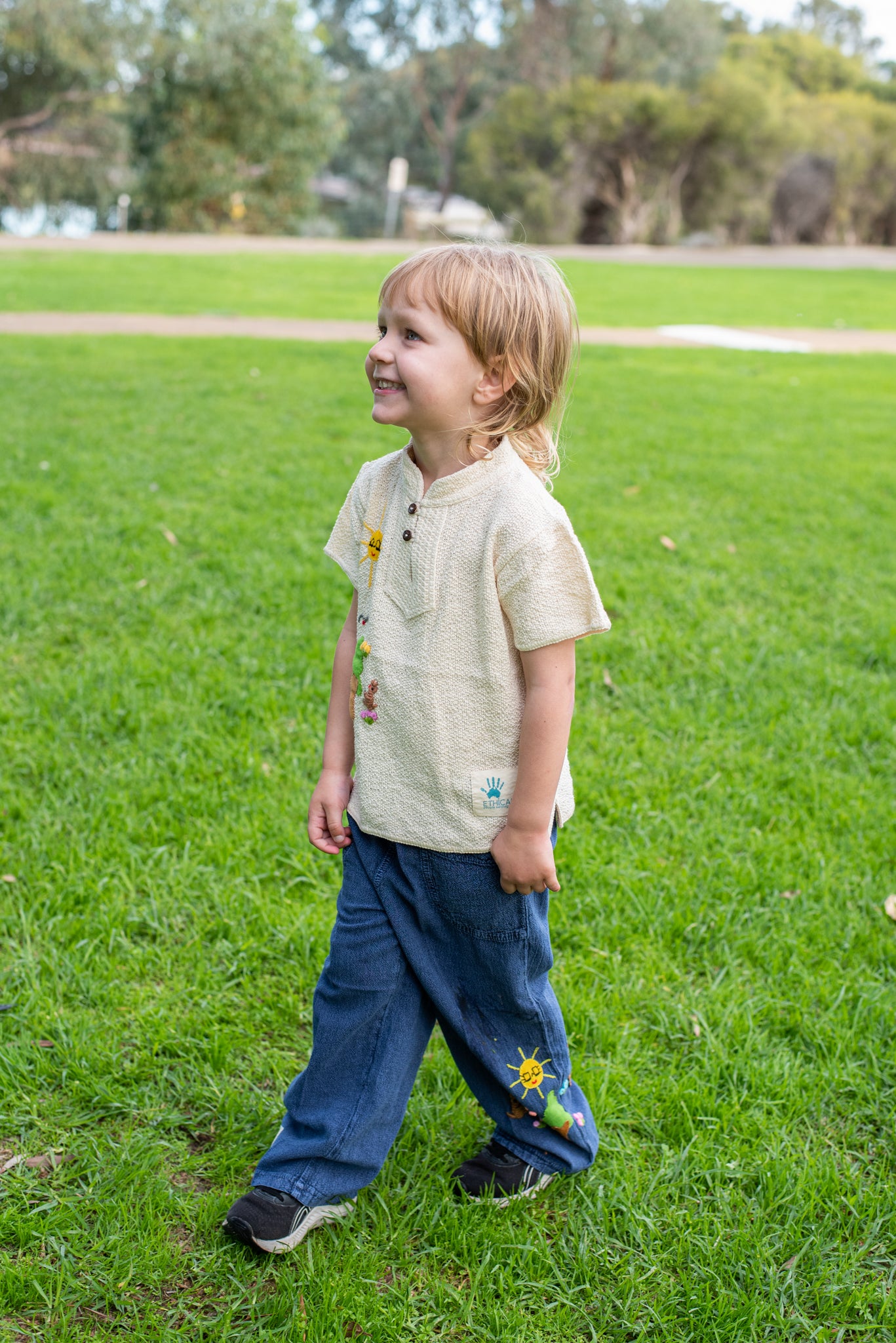The Jordan (Forest) pants are his armor for conquering puddles and playgrounds. The bounding kangaroo and dozing koala embroidery mirrors his fearless spirit, ready for frosty mornings or sunny days. Breathable Peruvian cotton fabric keeps up with his nonstop energy, making it perfect for every mission. This pair of pants is a celebration of Australia’s soul, stitched by hands in Peru that knows its rhythm. Handmade by artisans who stitch joy into every thread, just for his expeditions.