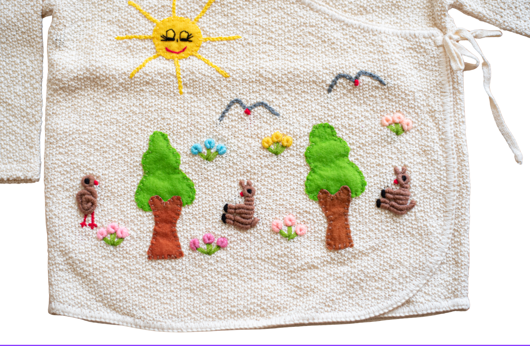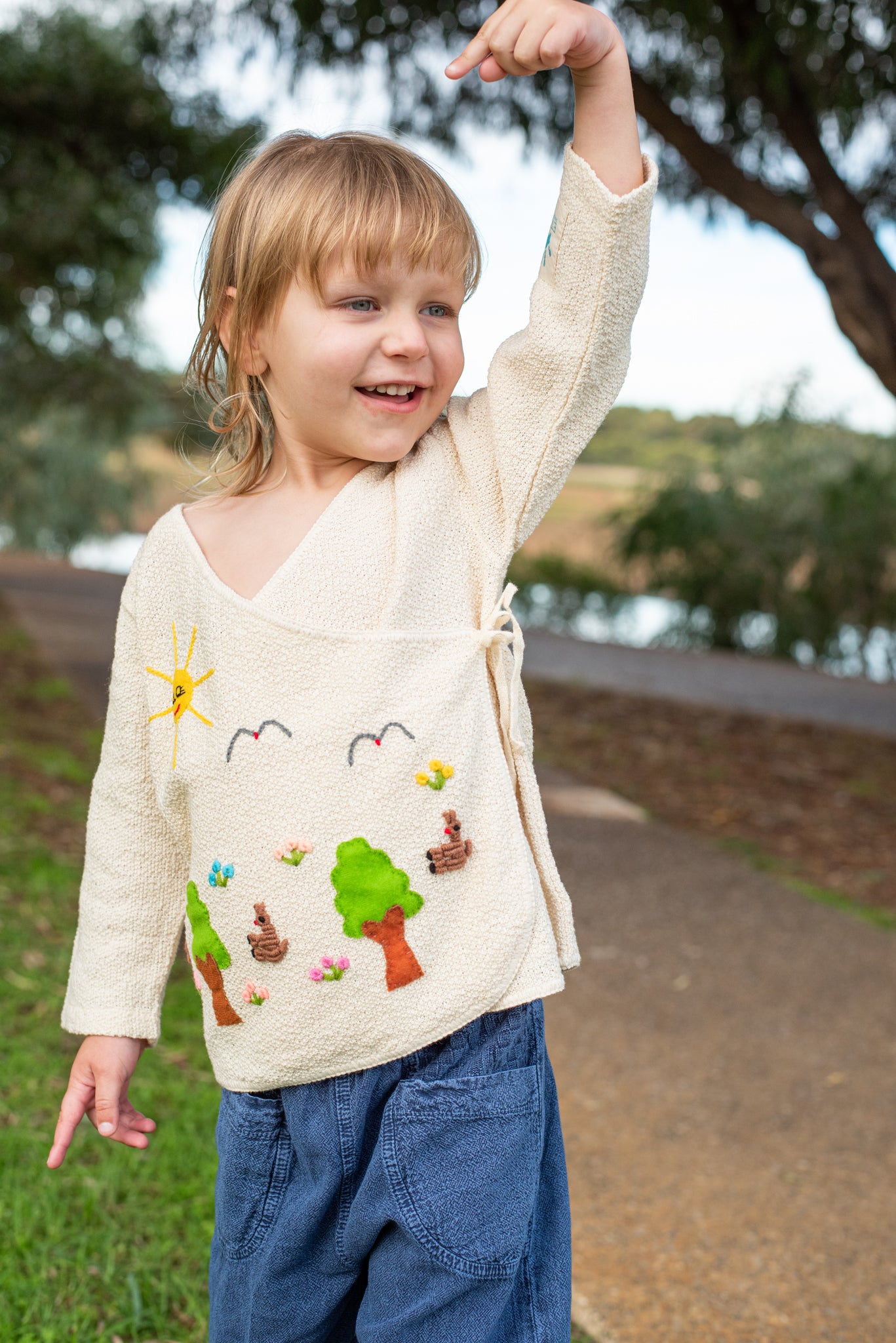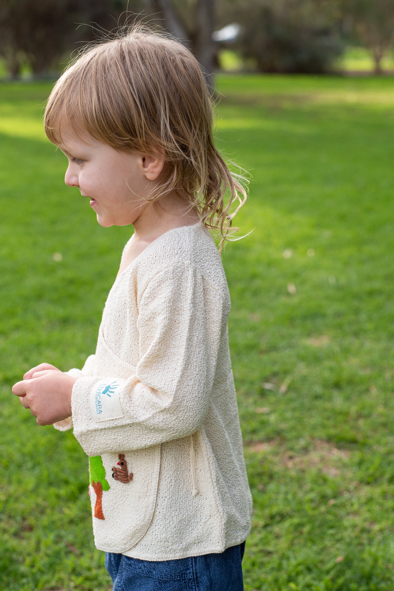 For little explorers and storybook heroes, the Alex (Forest) side tie cardigan is a passport to the magic of the bush. Every stitch tells an Aussie adventure: Koalas peek from ancient eucalyptus branches, kangaroos pause mid-bound, and emus dart through native bushes, all under a hand-stitched golden sky. This play-ready (or adventure-ready!) top is breathable for log-climbing missions and sturdy enough for leaf-collecting expeditions. Light as dappled sunlight for nestling in ferns, it's hand-stitched by Peruvian artisans to honor both wild places and wild imaginations.