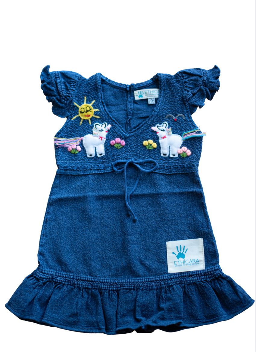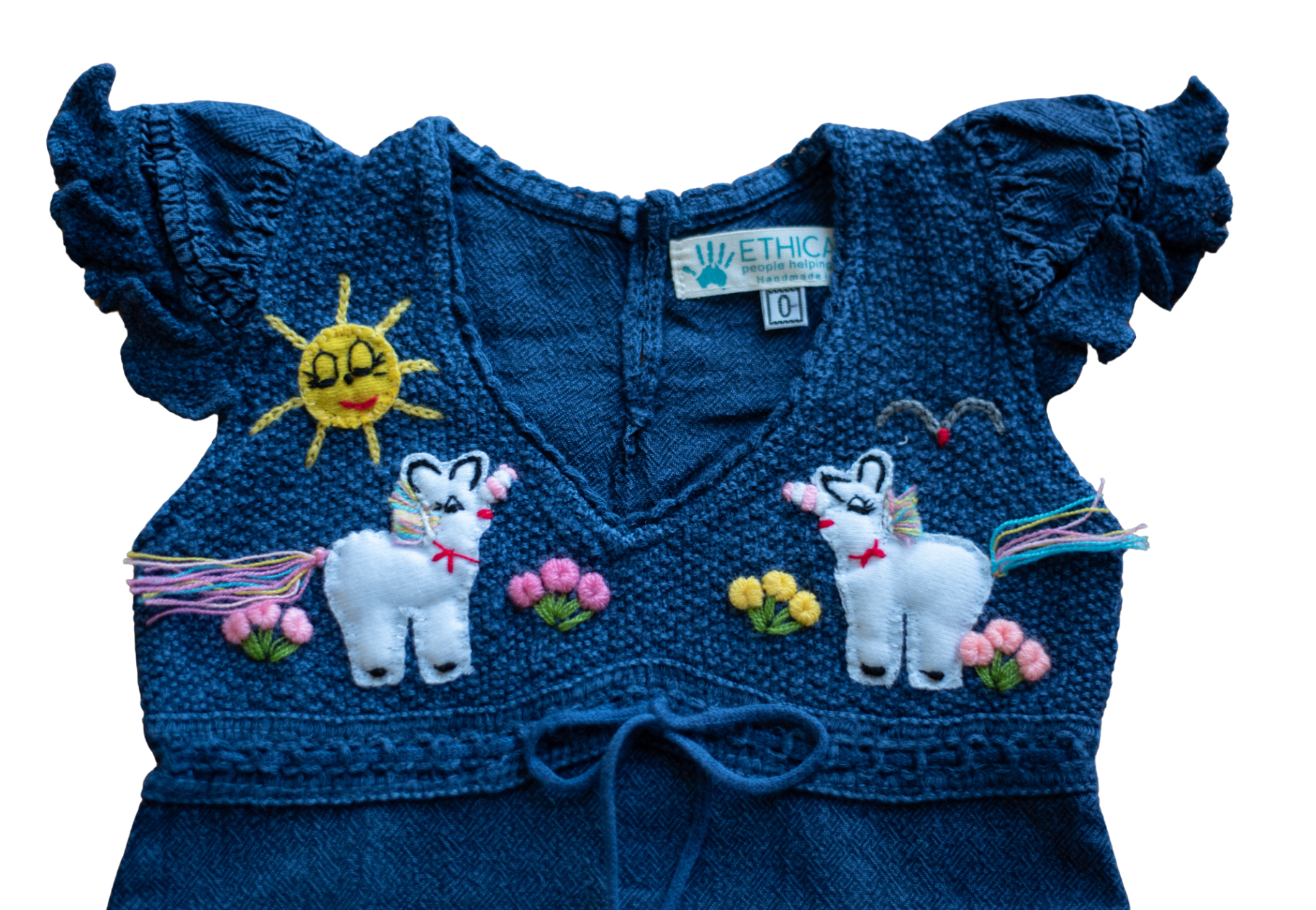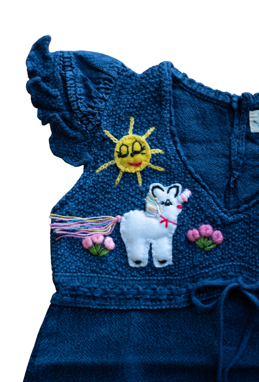 Get ready for pure magic with the Magui (Unicorn) ruffled cotton dress! This enchanting frock is a dream woven into fabric, featuring two majestic unicorns prancing across the front, surrounded by a sprinkle of cheerful flowers and a radiant sun. With its sweet front ribbon and beautiful ruffles that sway with every step, it's made for endless twirls, fantastical tea parties, and chasing rainbows. Crafted from our signature, whisper-soft Peruvian cotton, this dress is as comfortable as a cloud and light as a unicorn's mane, letting her imagination soar without limits. Each intricate detail is lovingly hand-stitched by skilled Peruvian artisans, bringing this magical scene to life and ensuring a truly heirloom-quality piece.