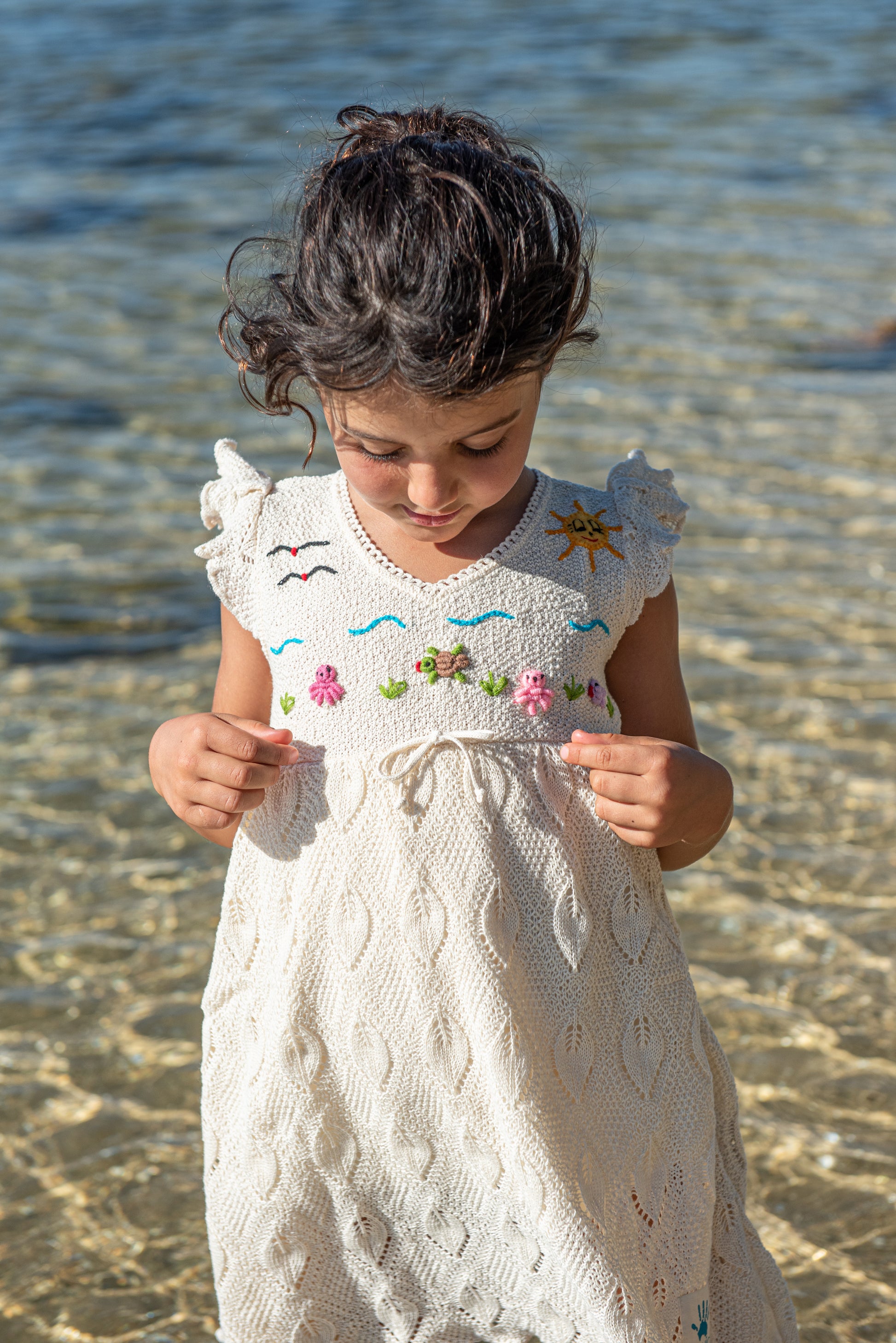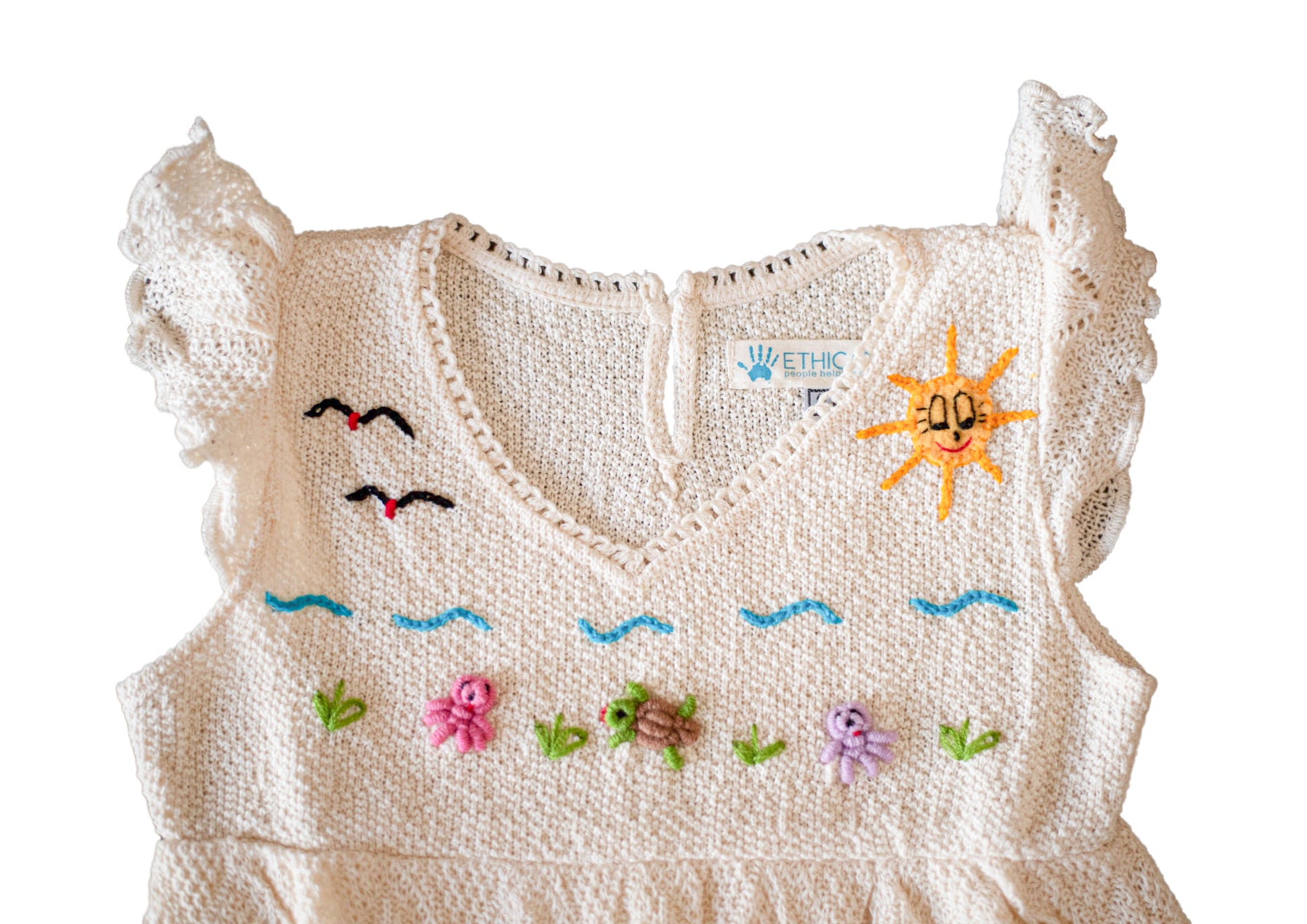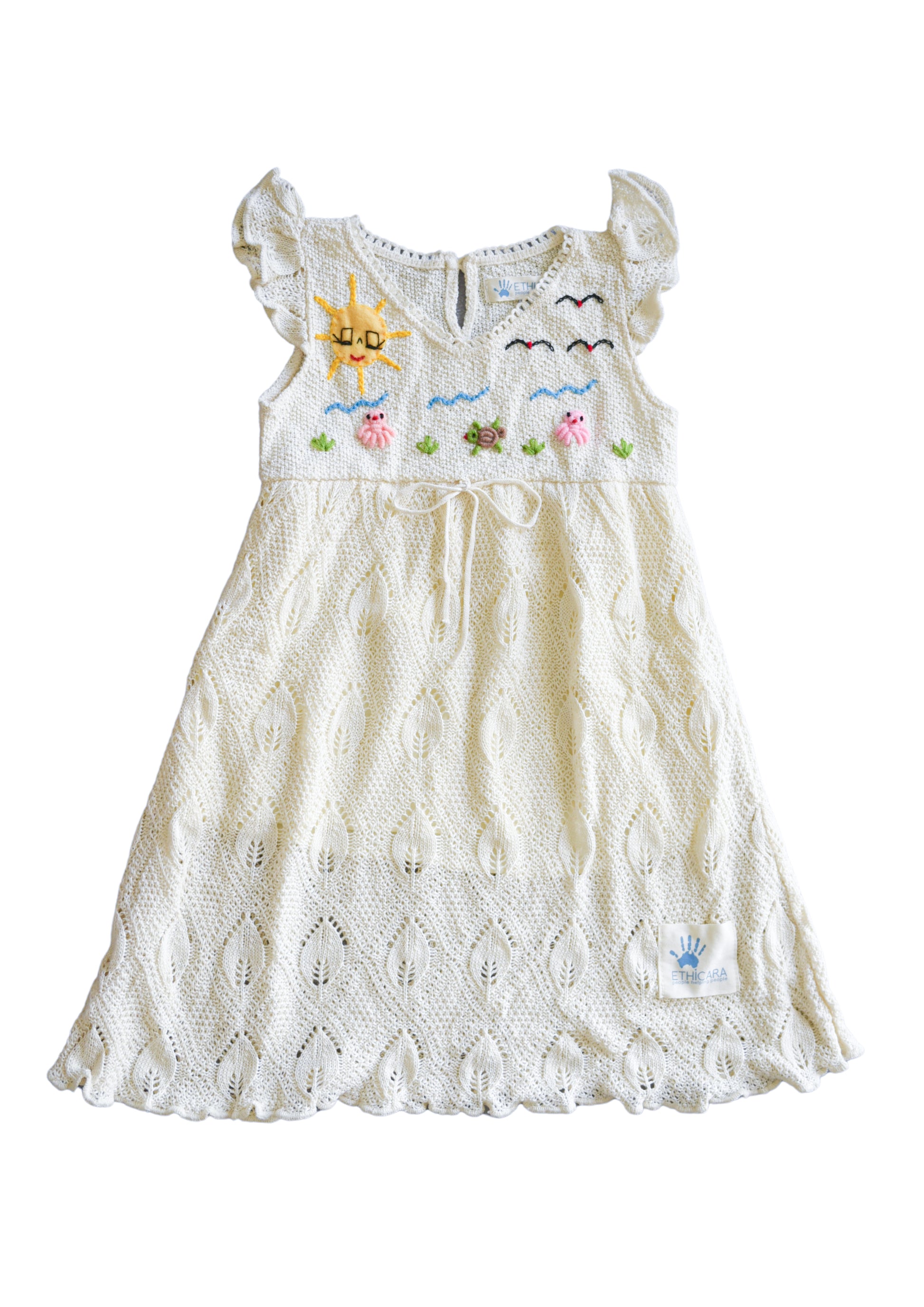 Make a splash in this ocean-inspired dress! Featuring delicate seashell embroidery on breathable cotton, perfect for twirling like a wave. Ethically crafted. 🌊
