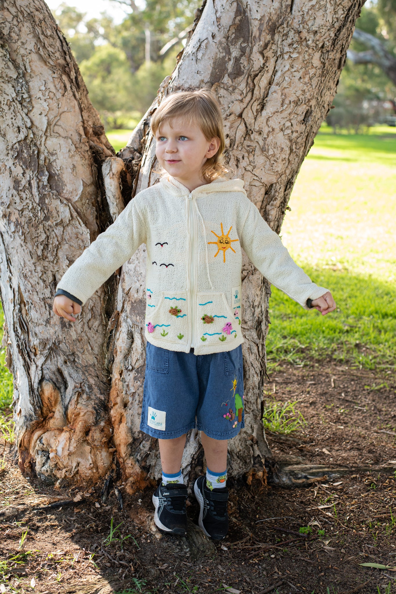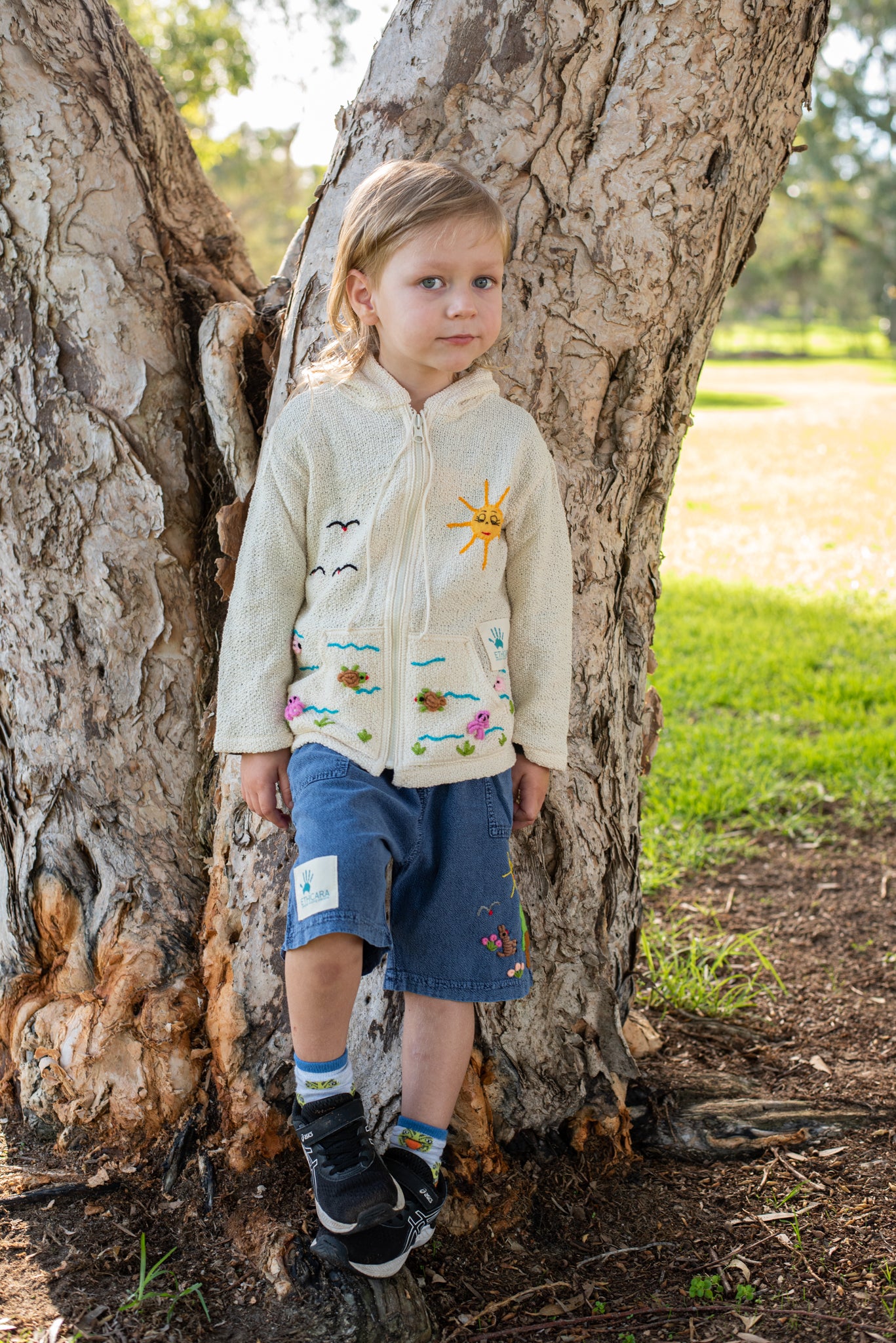 The Dylan (Forest) shorts are his passport to the magic of the bush. Every stitch tells an Aussie adventure: Koalas peek from ancient eucalyptus branches, kangaroos pause mid-bound, and emus dart through native bushes, all under a hand-stitched golden sky. Crafted from breathable Peruvian cotton, these shorts are tough enough for bark-scaling adventures yet soft as dappled sunlight for nestling in ferns. It’s a canvas of native magic, handmade by Peruvian artisans to spark imagination under open skies and honor wild places.