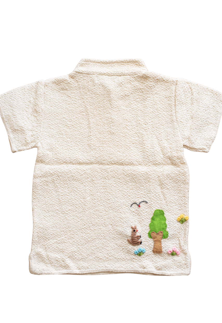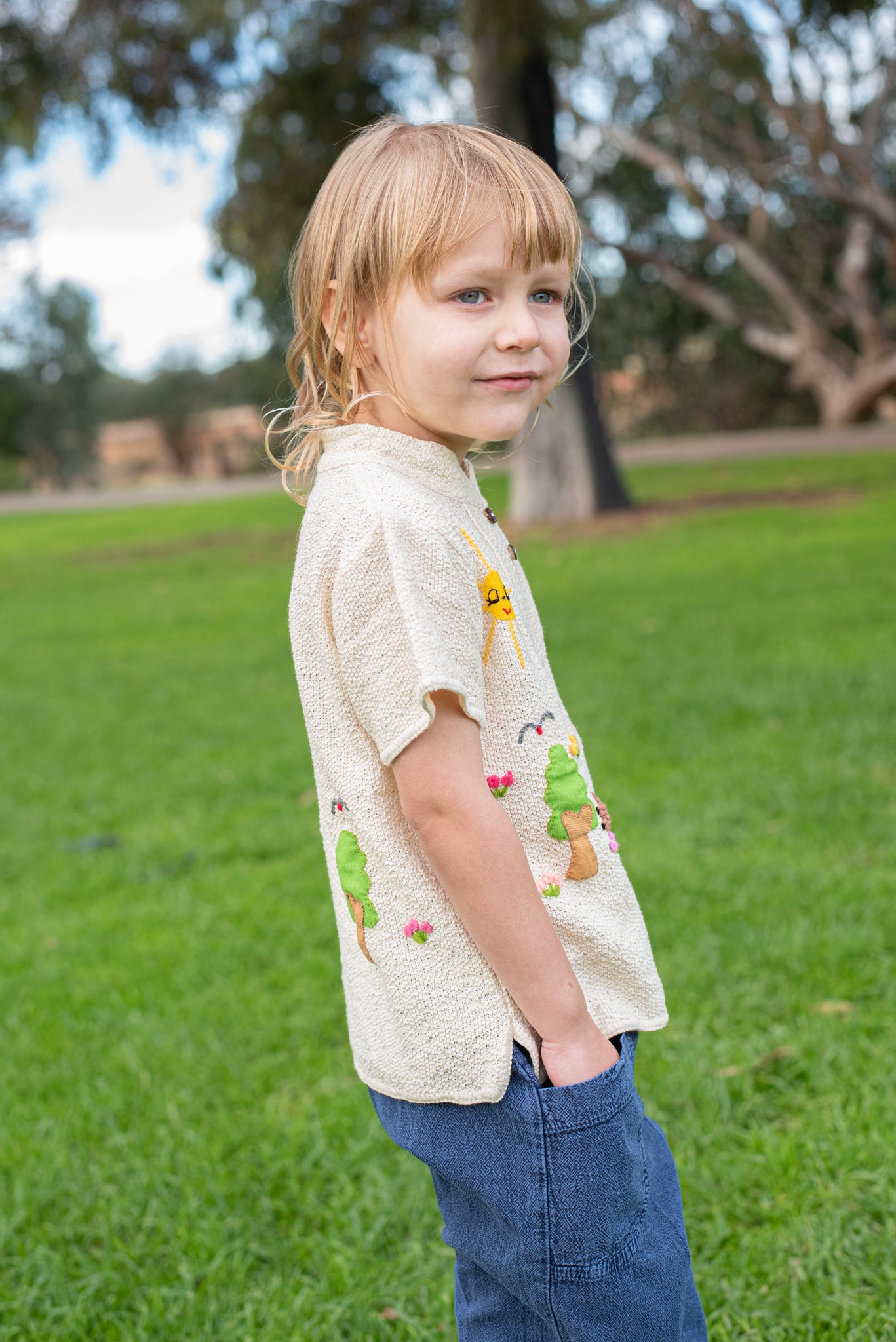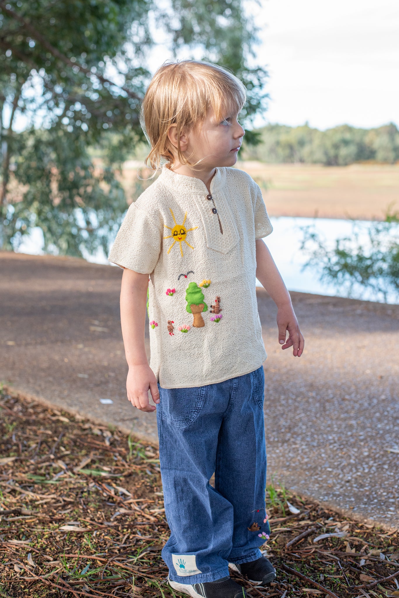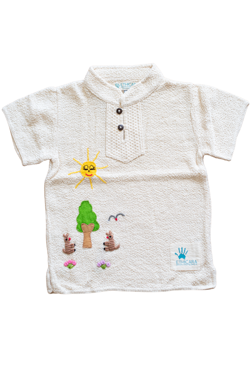 The Luigi (Forest) t-shirt invites little ones on a journey through the Australian bush. Hand-stitched Australian animals like koalas dozing in eucalyptus, kangaroos mid-leap, and emus darting through native shrubs bring the magic of the wilderness to life on this comfortable t-shirt. Designed to be breathable as sunlight through the branches and soft enough for all-day play, it's perfect for climbing, exploring, and imaginative adventures. Each stitch is a testament to the patient artistry of Peruvian artisans, honoring both wild places and wild imaginations.