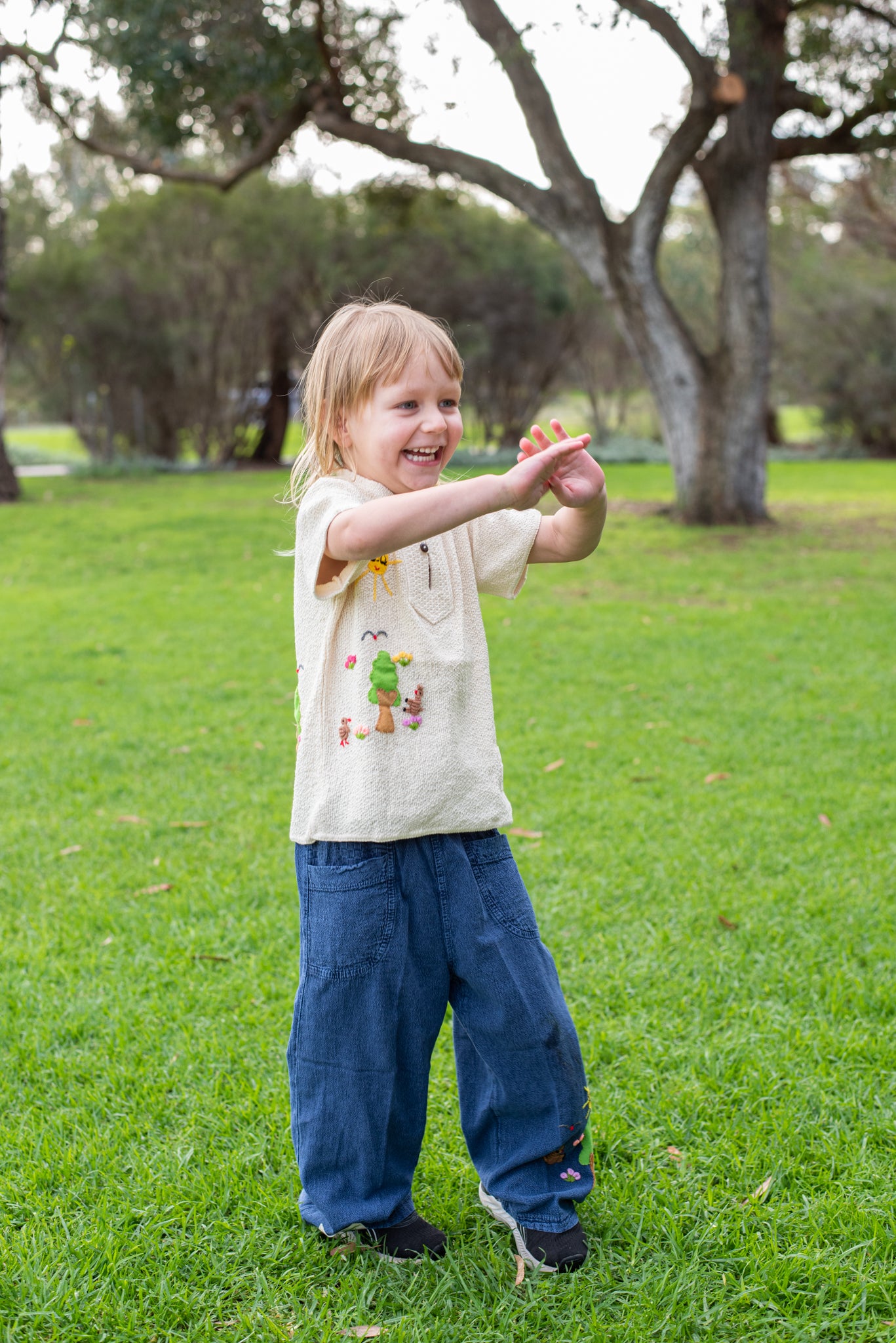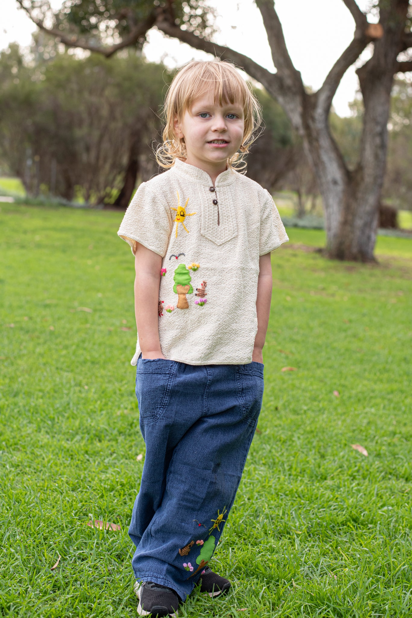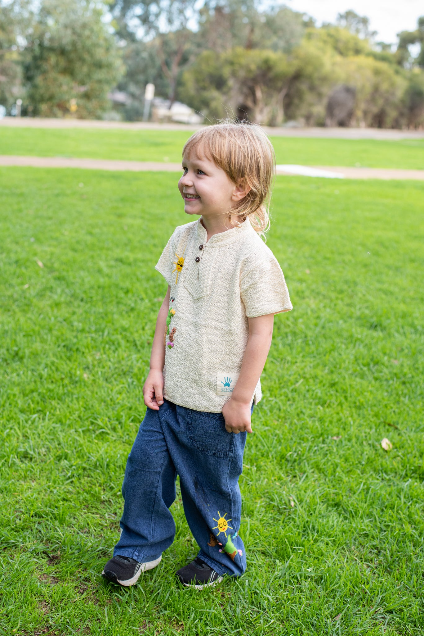 The Luigi (Forest) t-shirt invites little ones on a journey through the Australian bush. Hand-stitched Australian animals like koalas dozing in eucalyptus, kangaroos mid-leap, and emus darting through native shrubs bring the magic of the wilderness to life on this comfortable t-shirt. Designed to be breathable as sunlight through the branches and soft enough for all-day play, it's perfect for climbing, exploring, and imaginative adventures. Each stitch is a testament to the patient artistry of Peruvian artisans, honoring both wild places and wild imaginations.