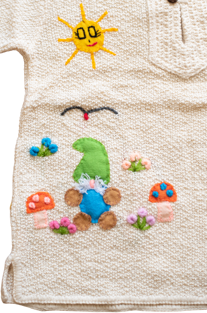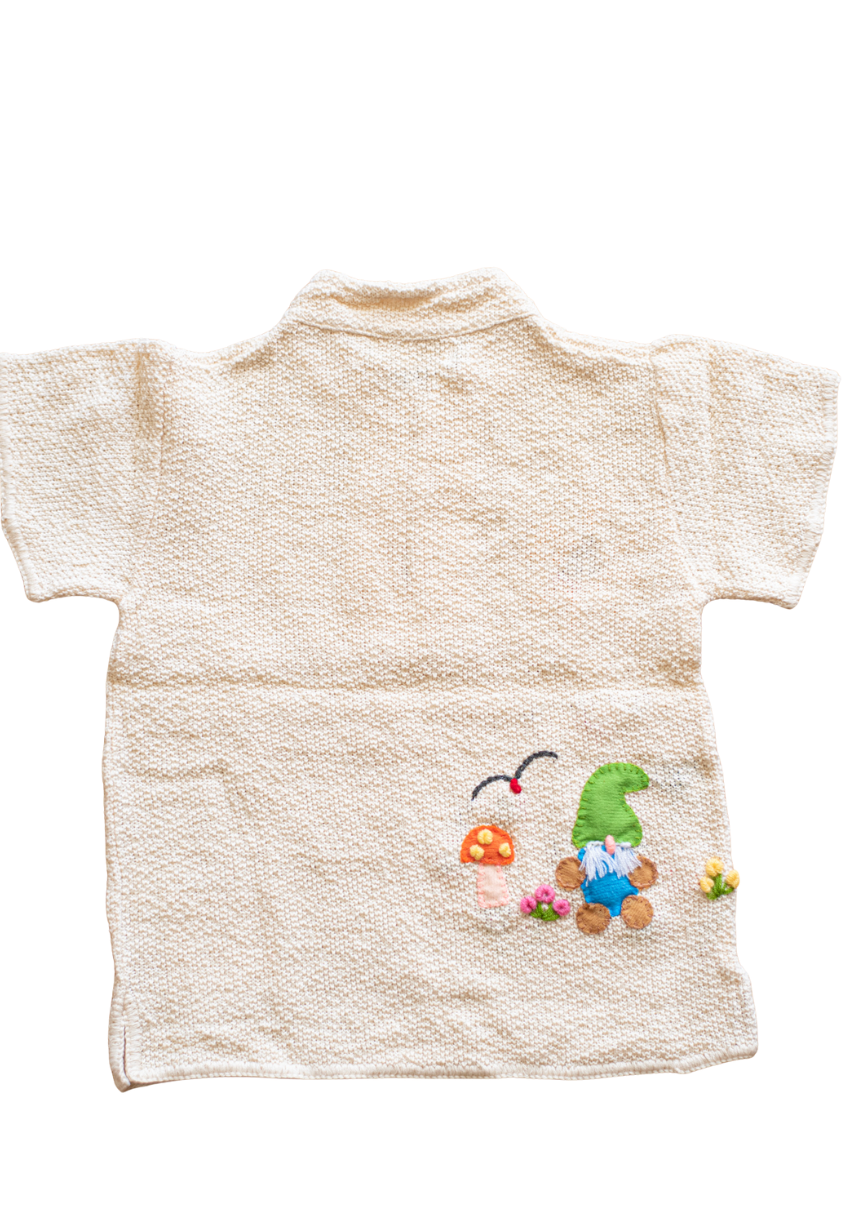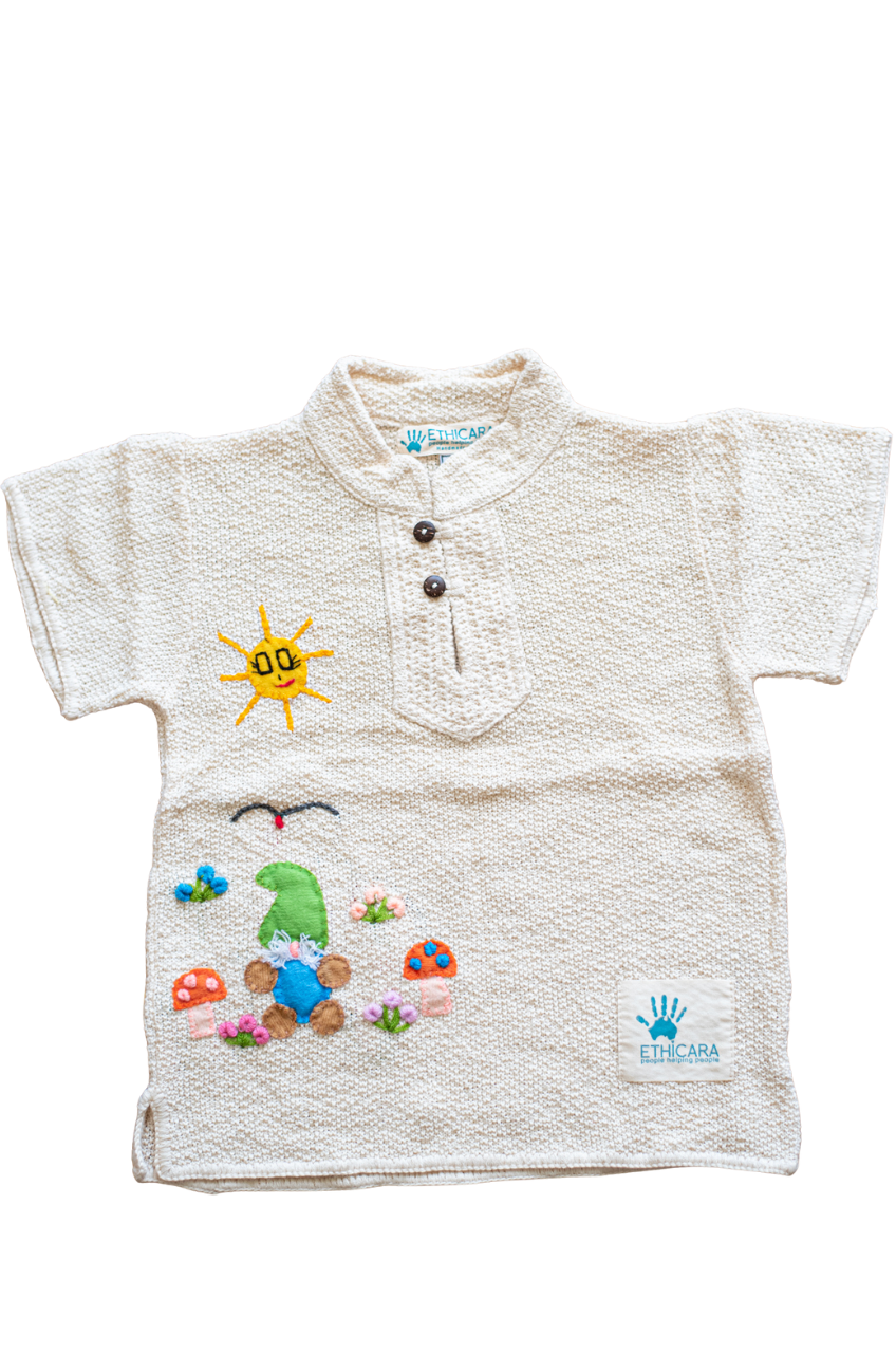 Step into a story! This delightful cotton t-shirt features charming hand-stitched garden gnomes, ethically crafted in Peru for magical play and everyday comfort.