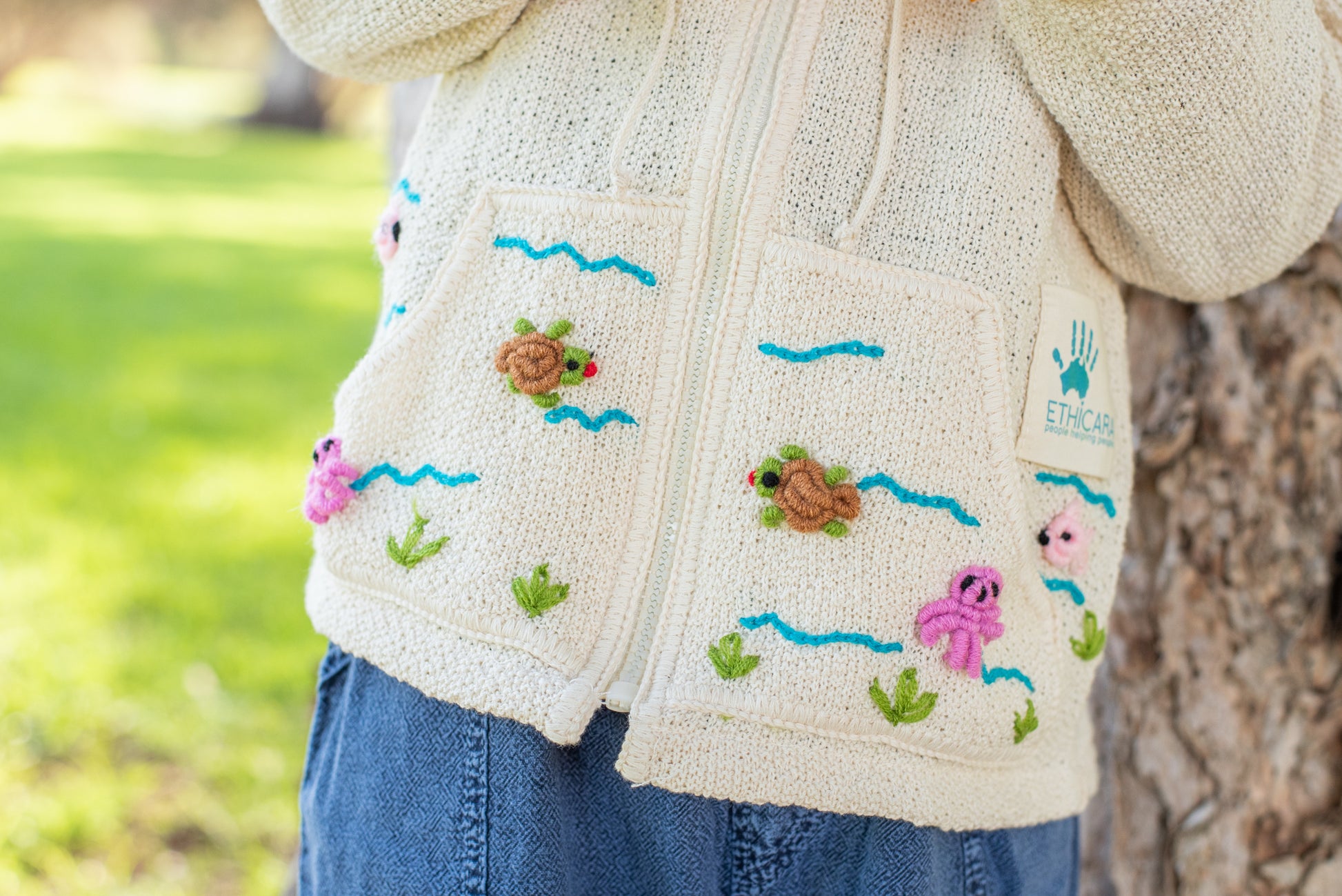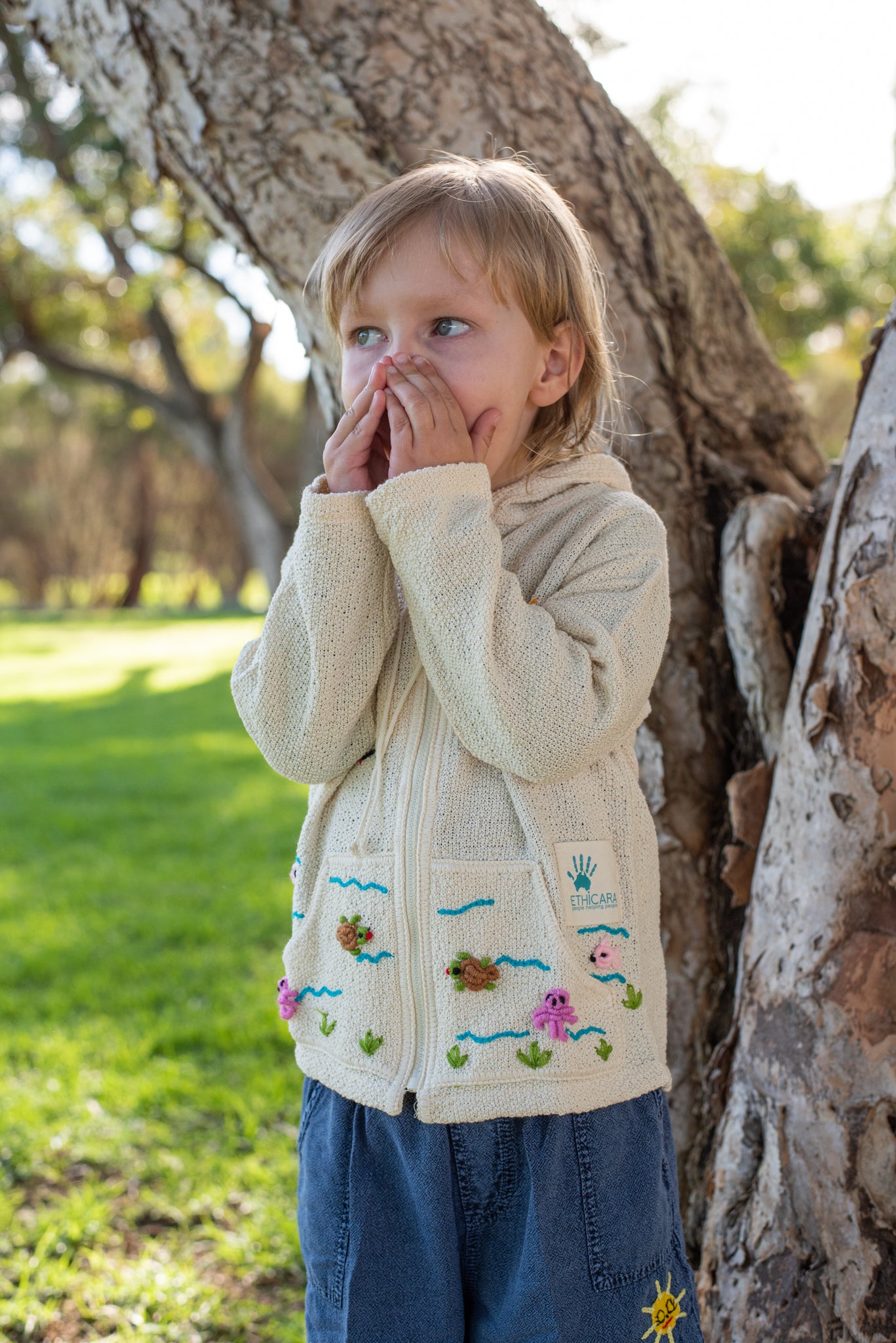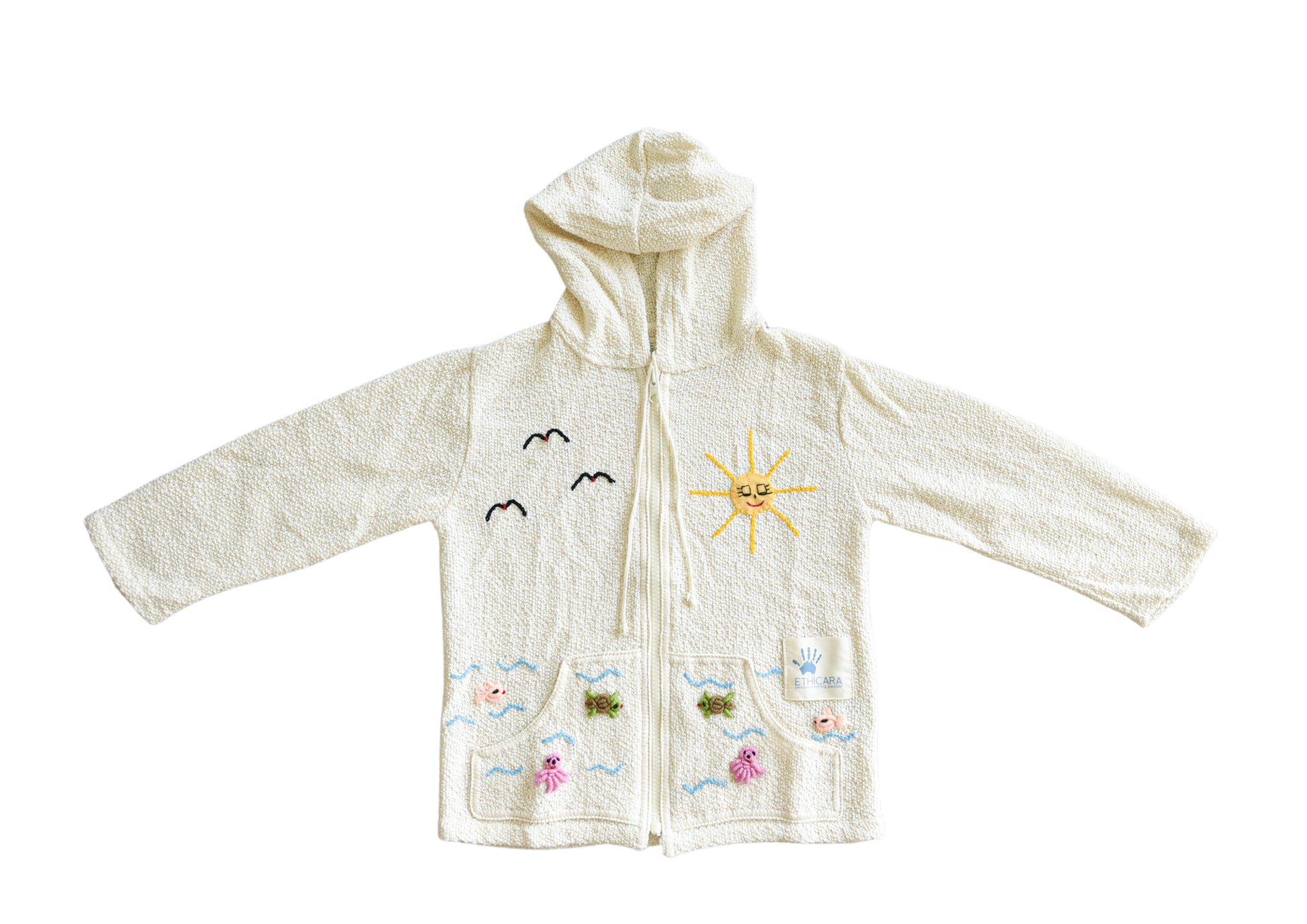Brave the waves in style! This ocean-themed jacket features a hood with secret sea creatures, crafted from ultra breathable Peruvian cotton. š§ļøš