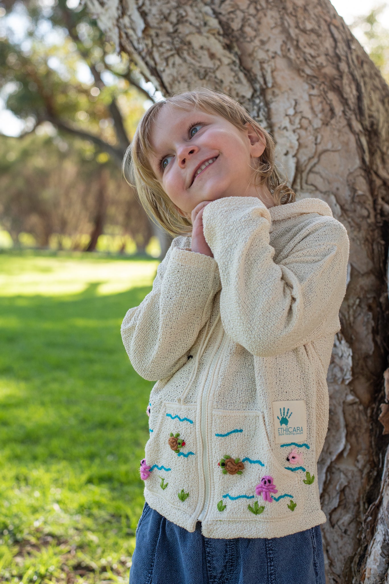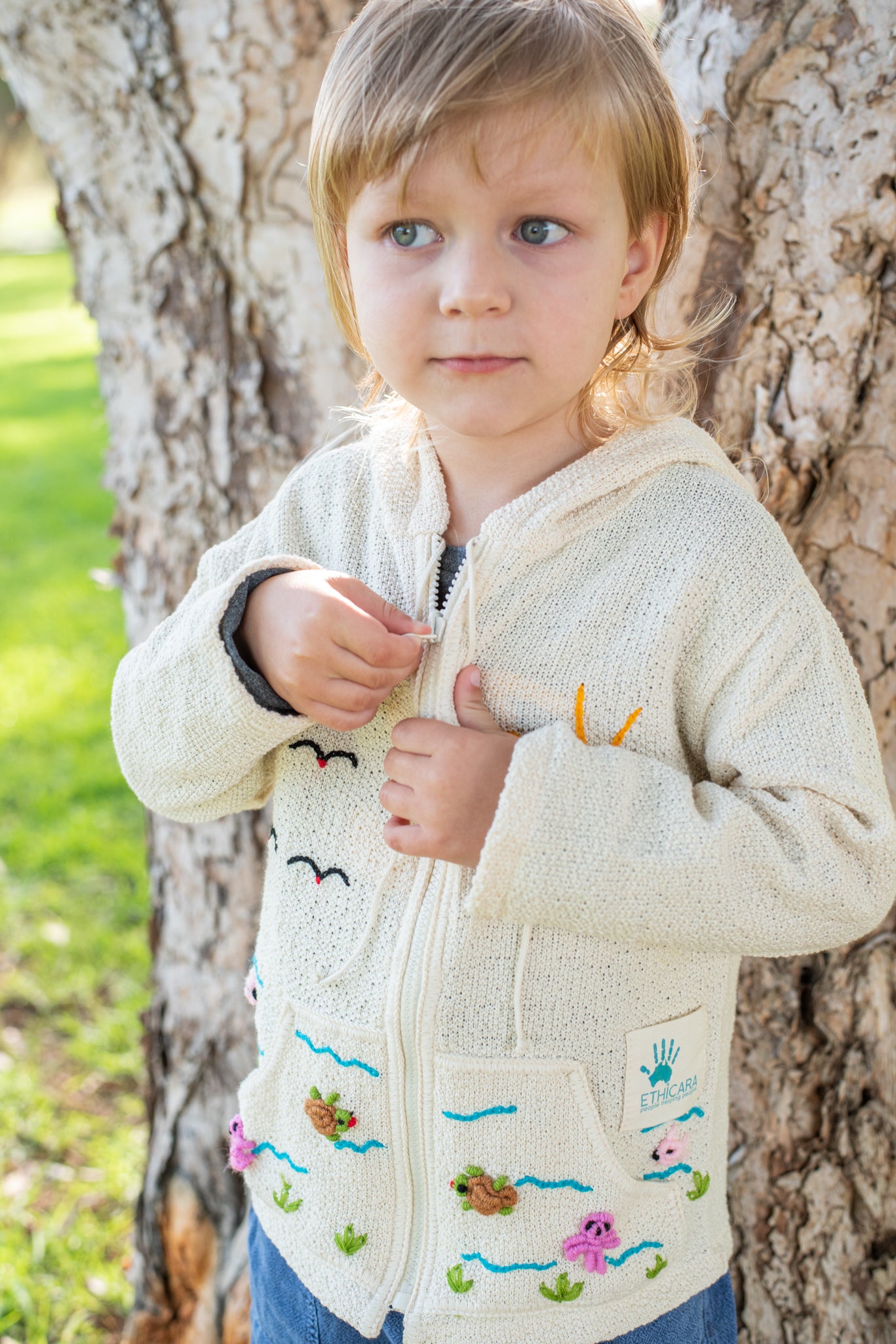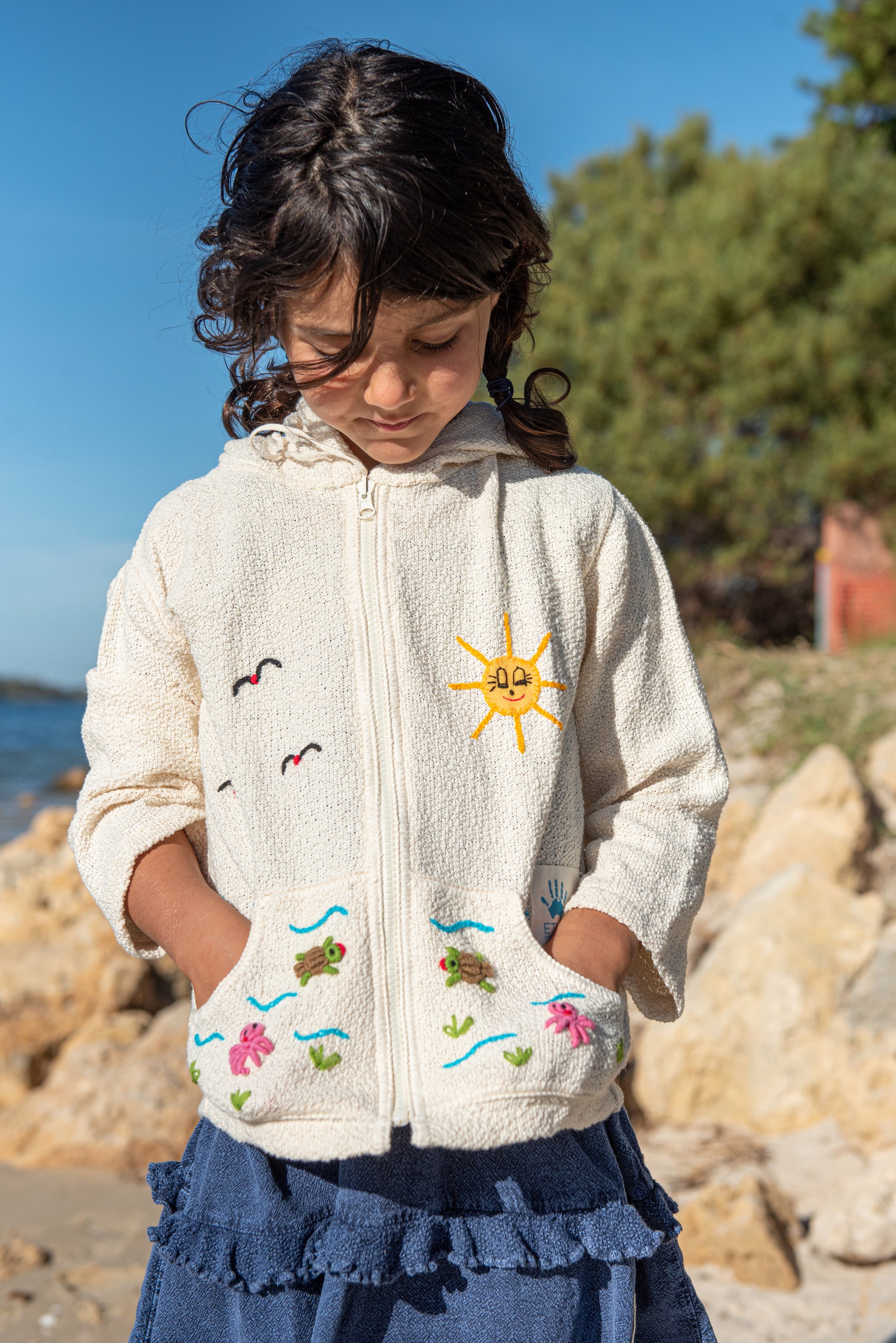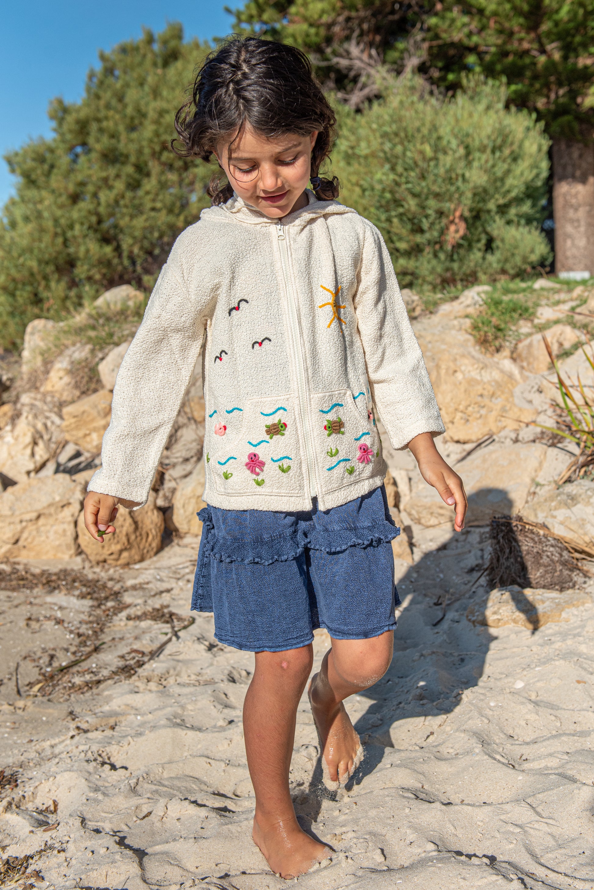 Flip up the hood to uncover embroidered starfish treasures, a special surprise for beachcombers and tidepool scientists. Made from breathable Peruvian cotton that dances with ocean breezes, this swingy layer turns pinecone hunts and seaside sprints into adventures.