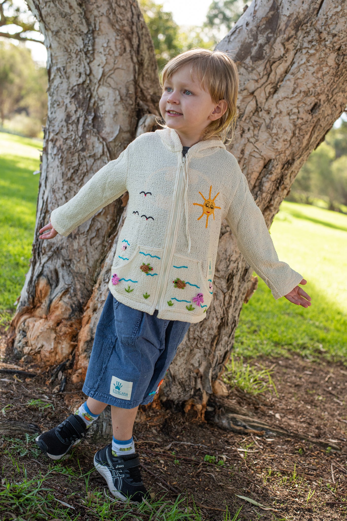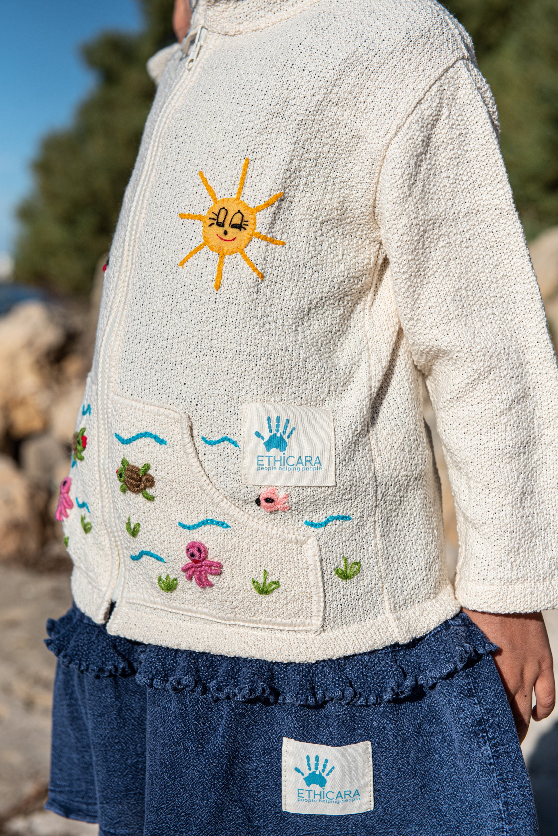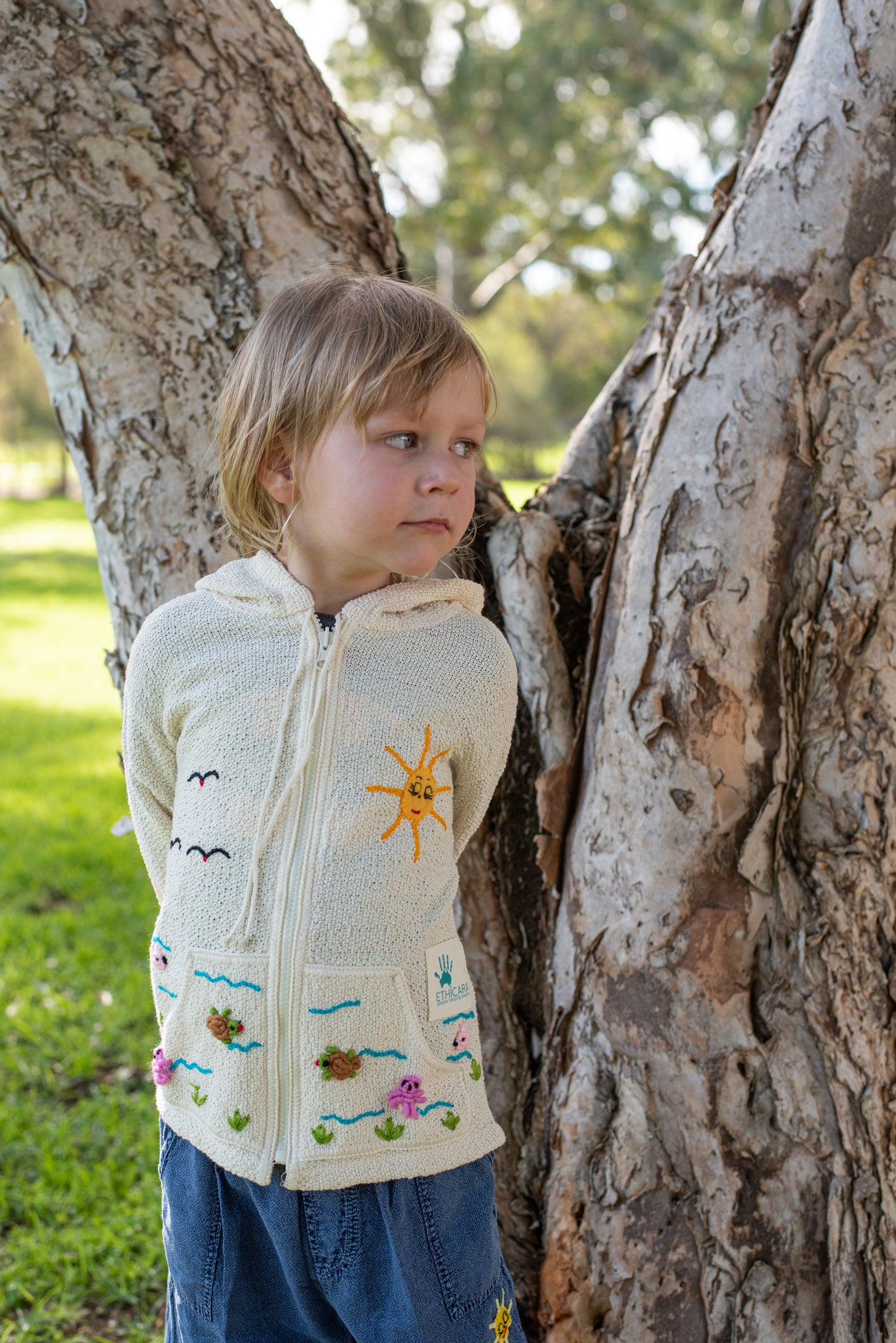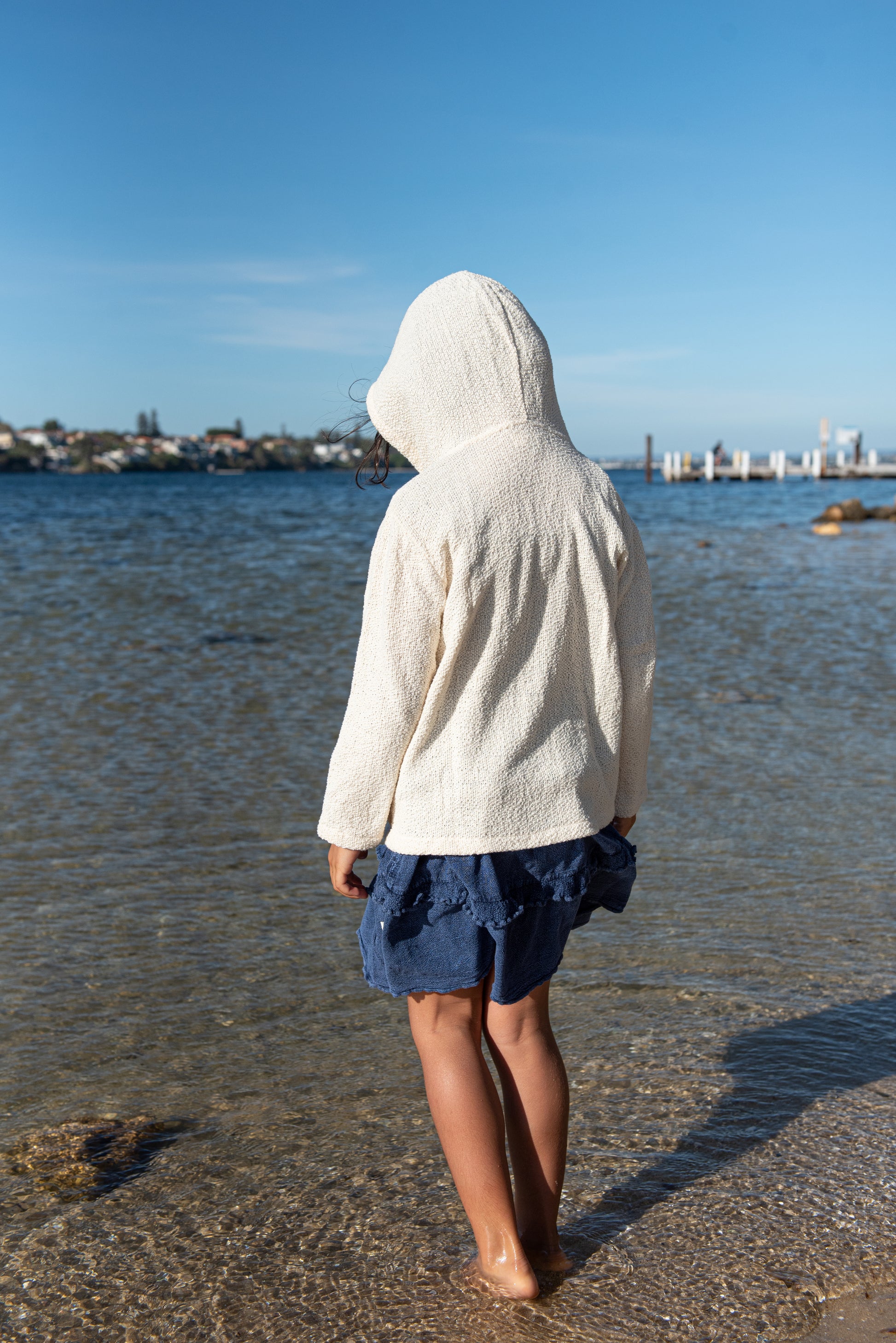 Flip up the hood to uncover embroidered starfish treasures, a special surprise for beachcombers and tidepool scientists. Made from breathable Peruvian cotton that dances with ocean breezes, this swingy layer turns pinecone hunts and seaside sprints into adventures.