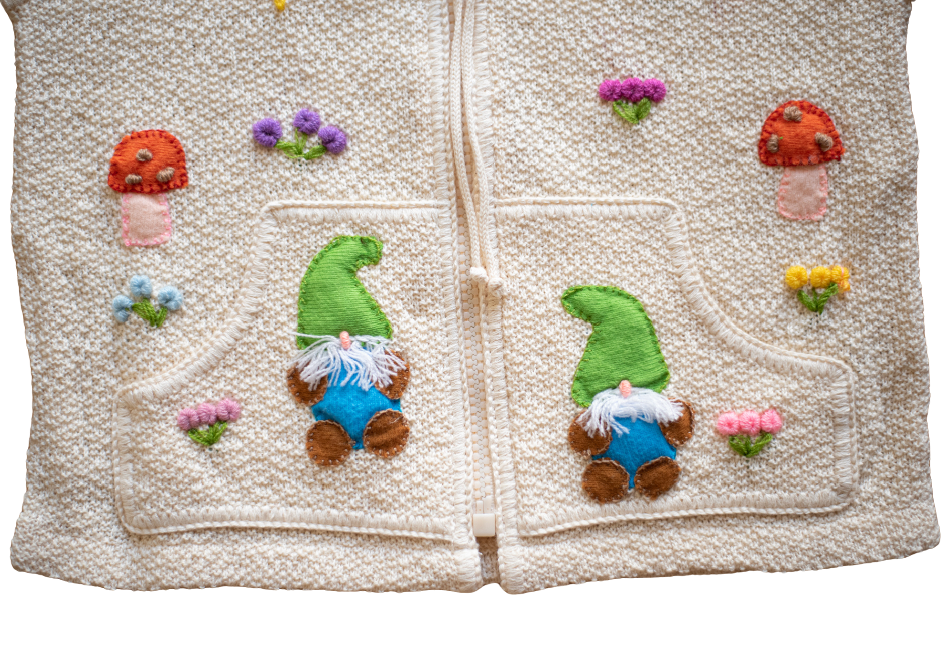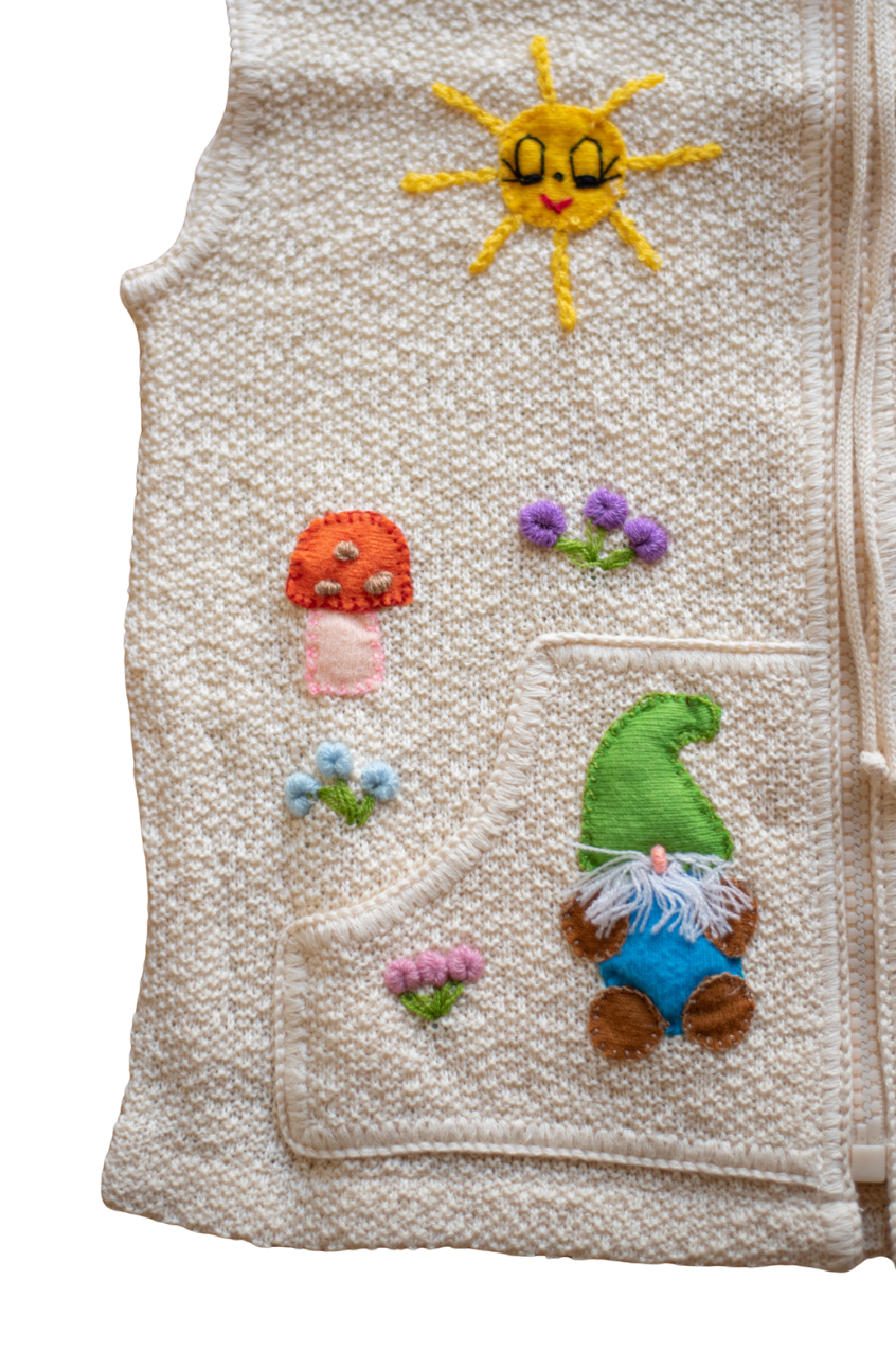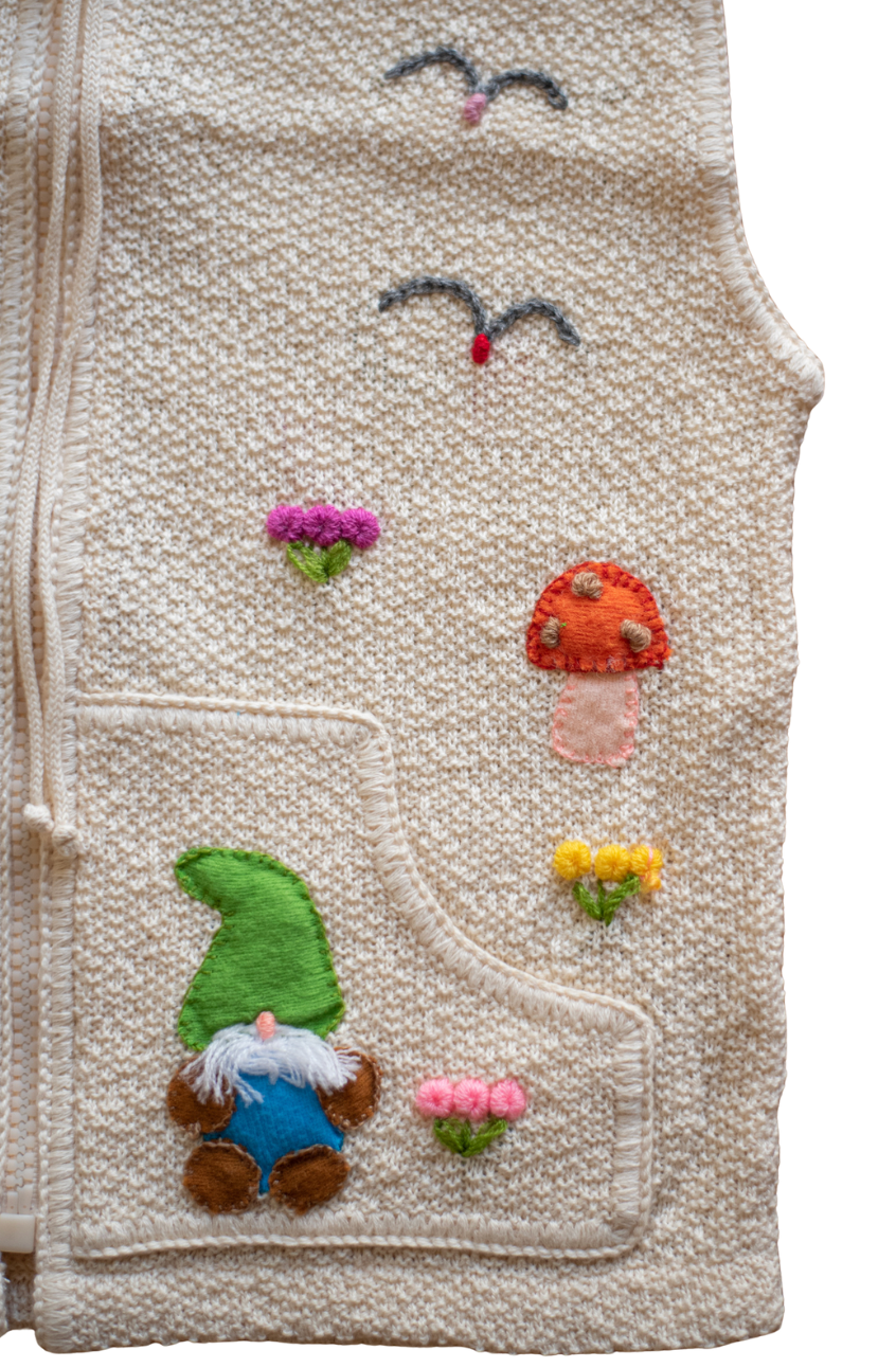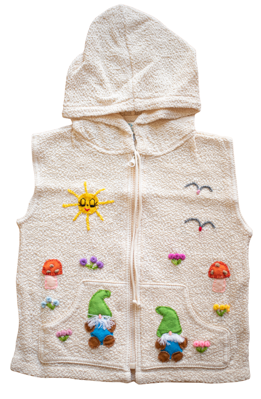 Step into a story! This delightful hooded vest features charming hand-stitched garden gnomes, ethically crafted in Peru for magical play and outdoor adventures.
