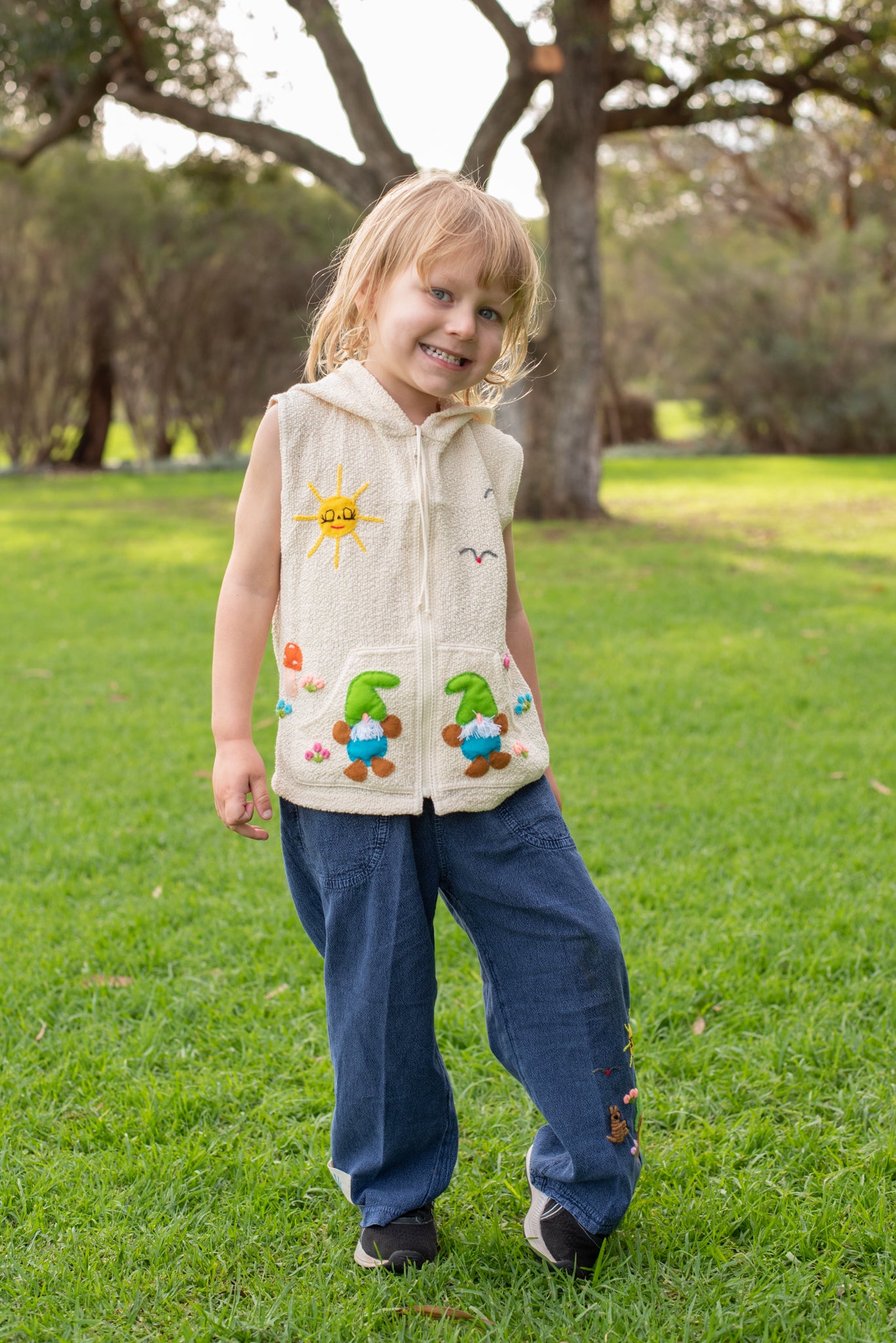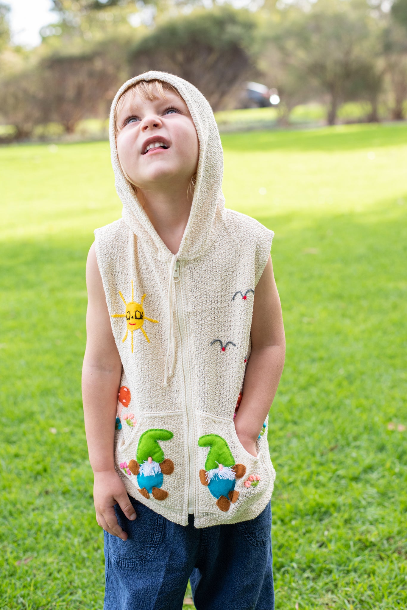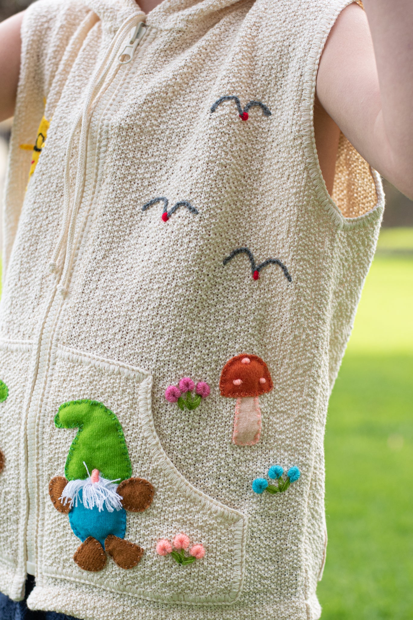 Enchanted Garden Hooded Vest | Hand-Embroidered Gnome Design | Ethicara Australia